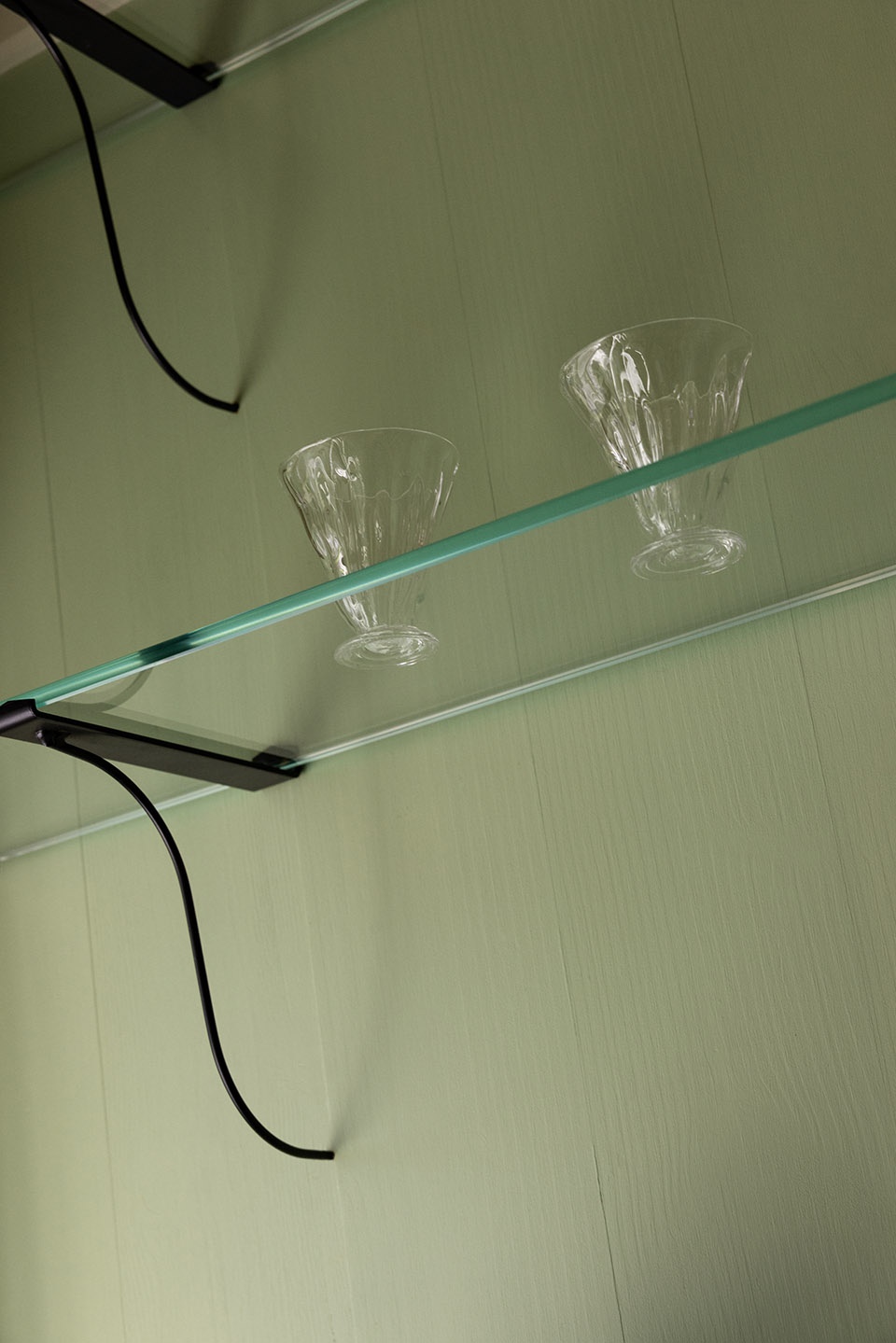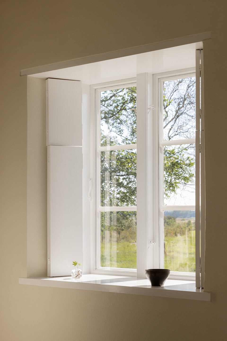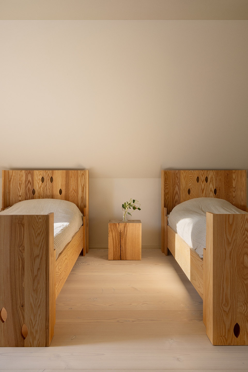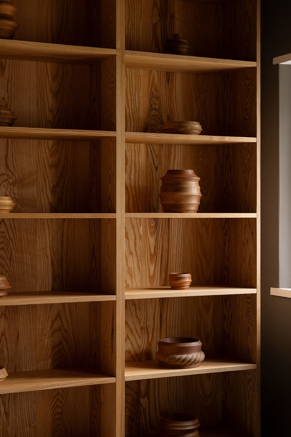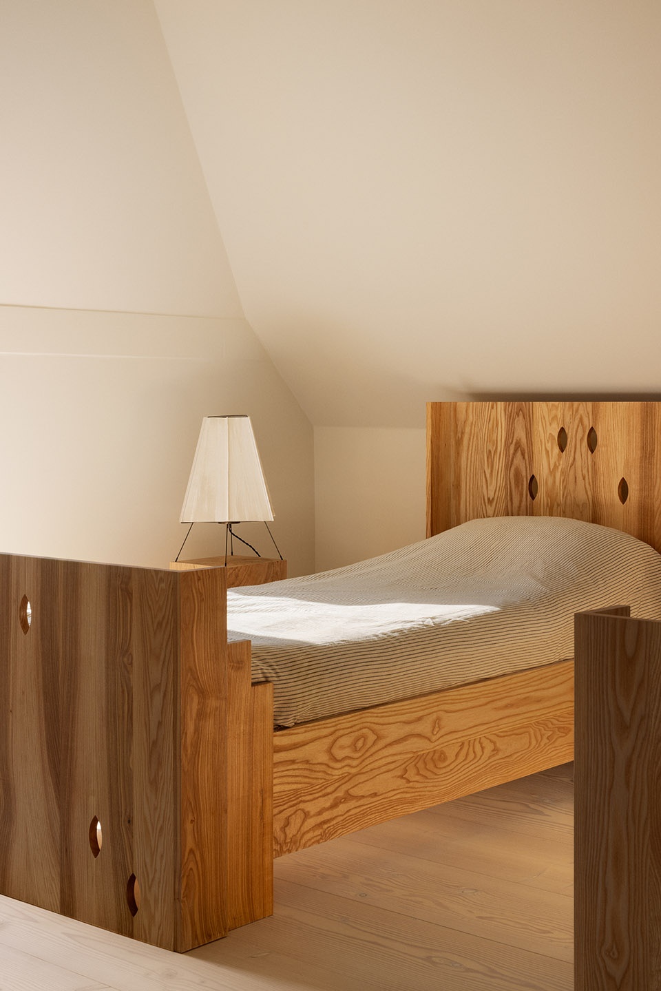 While the original framework carried out by Overby was still sound, Mentze Ottenstein reviewed all surfaces and material compositions, introducing a fresh take on colour and working thoroughly with detailing to create a more harmonious experience. The handcrafted kitchen cabinets have been painted an eye-catching shade of green as a nod to its countryside location. Elsewhere, a series of hand-turned ceramic bowls from Georgia sit comfortably alongside new walnut and pear kitchen handles. Further colour can be seen in the aisles and small chambers on the first floor, painted in golden ochre, creating a warm and intimate experience.