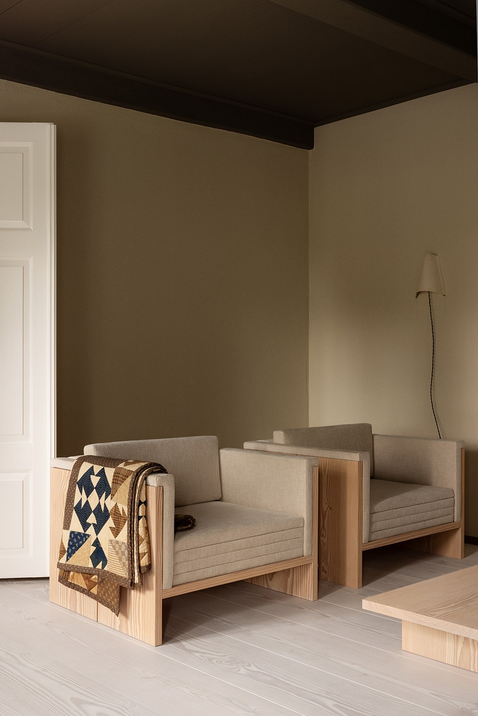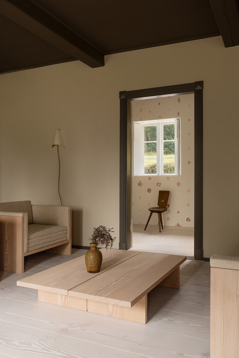 Mentze Ottenstein approached the task of reimagining the estate with humility and respect for Overby’s initial restoration. The studio’s work strongly emphasises context, often incorporating historical references and revealing unfamiliar narratives through in-depth research. While the framework of the original building remains, Mentze Ottenstein has introduced more material and ornamental qualities to the house. The connecting rooms were previously all very similar but now offer guests an element of surprise through the use of colour and the creation of hidden rooms.