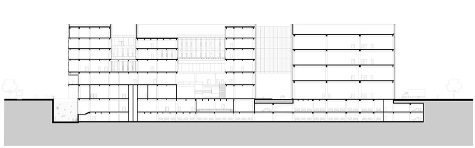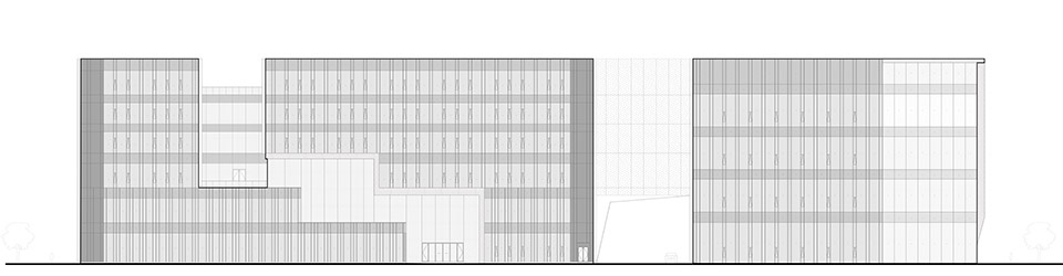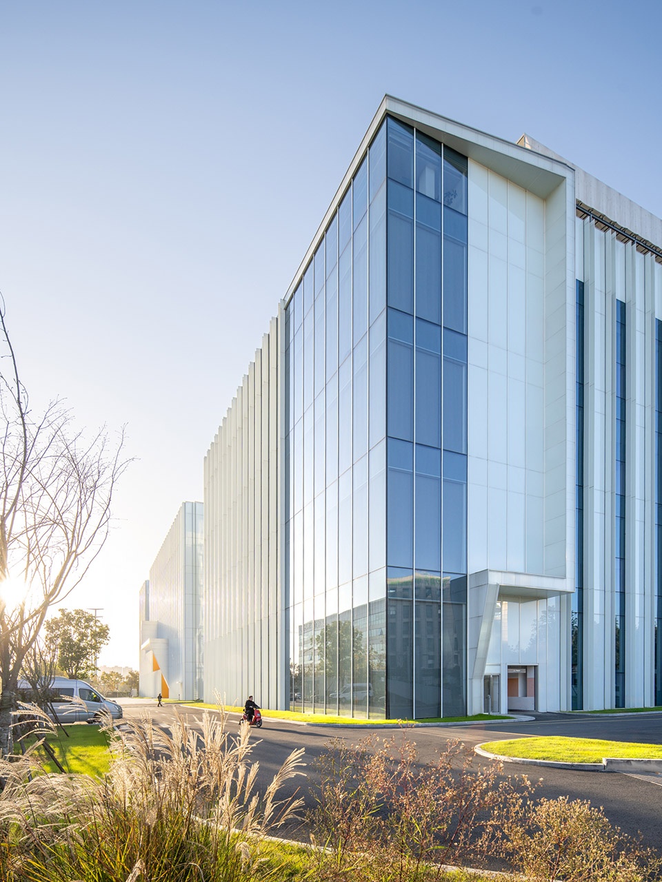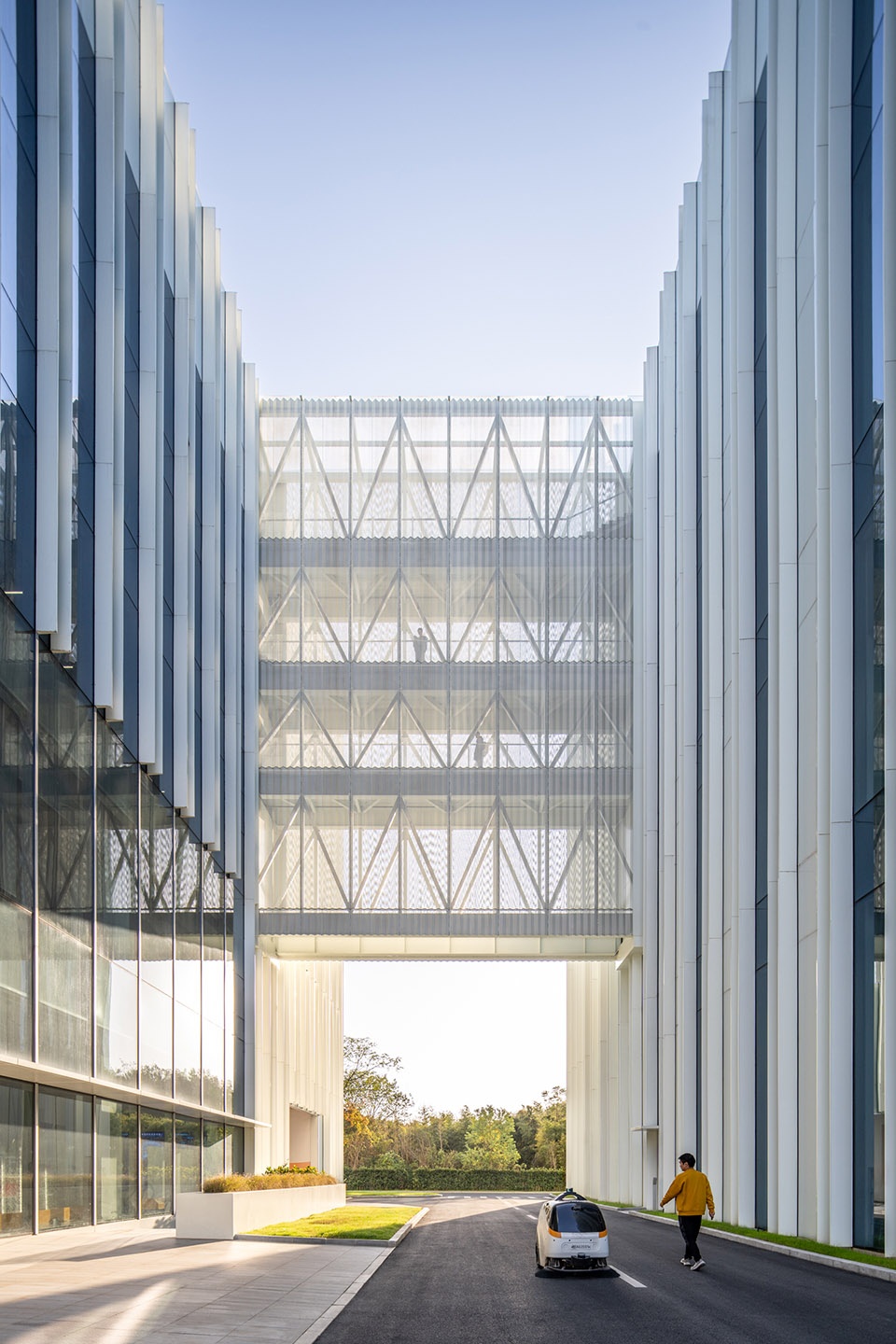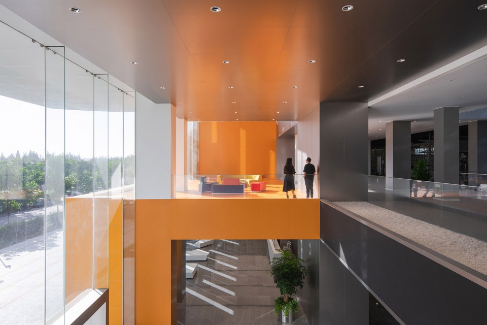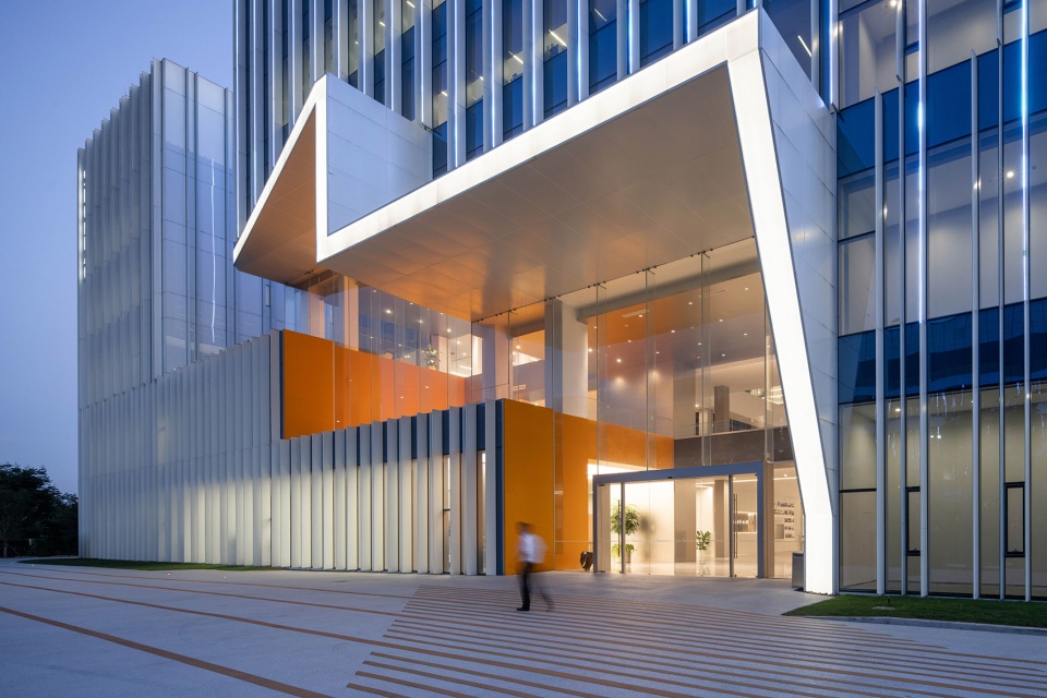 场地被划分为两个主要功能区域:东侧建筑用于办公和研发,西侧建筑则用于生产制造。两栋主体建筑通过3-5 层的连廊相互连接。