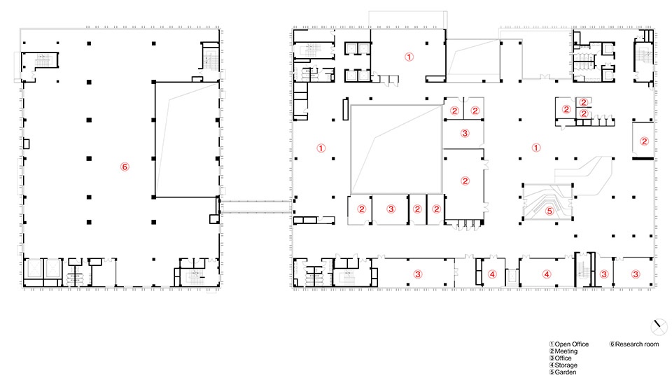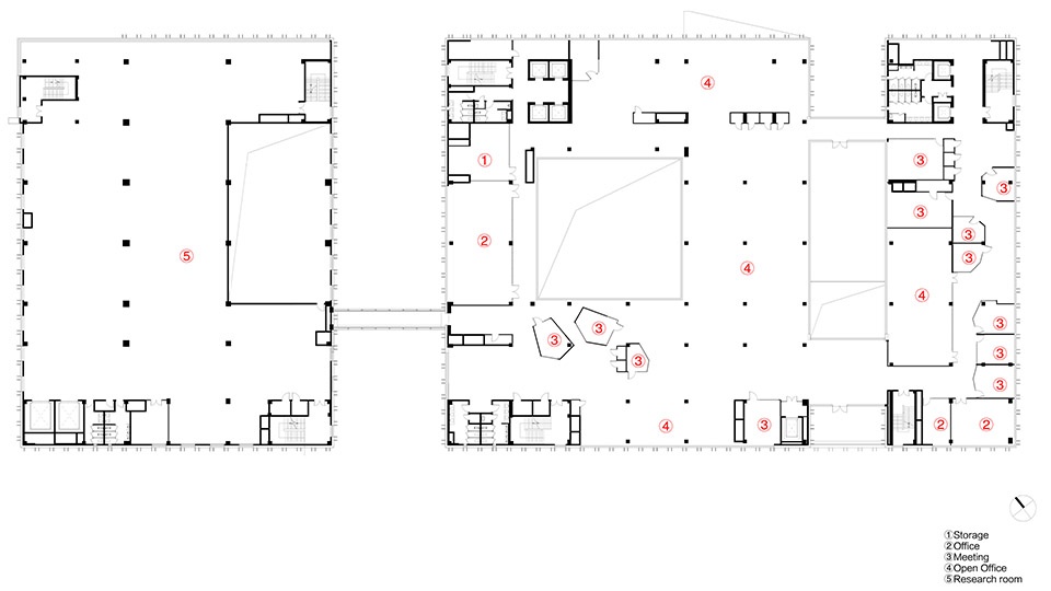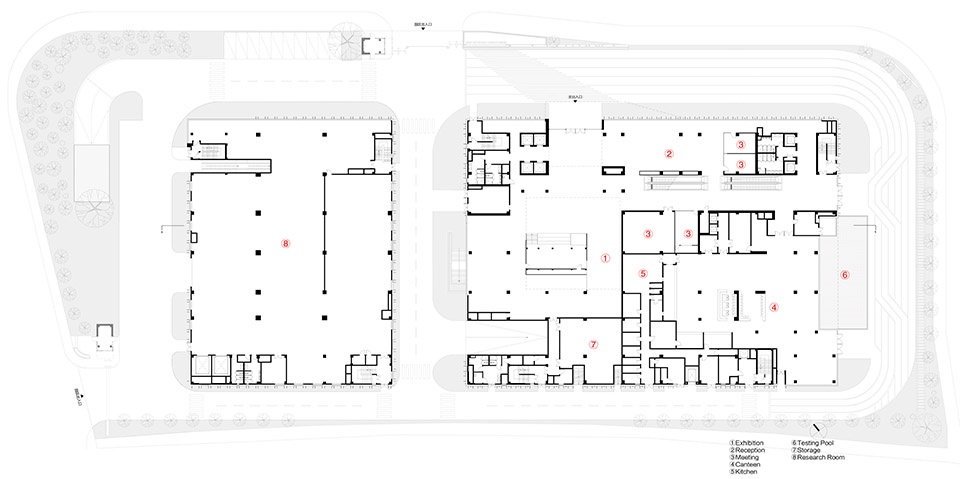 The site is divided into two main functional areas: the eastern building for office and R&D, and the western building for production and manufacturing. The two main structures are connected by a corridor on the 3rd to 5th floors.