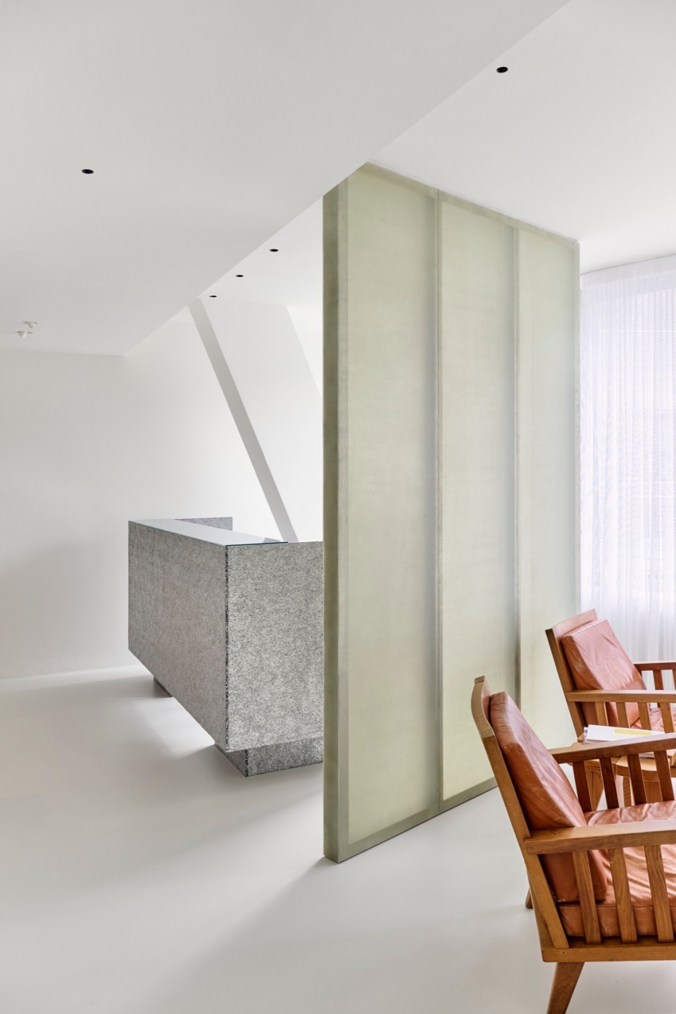 诊疗室的门选用胡桃木与“教堂玻璃”(Cathedral Glass)制成,与整体冷峻、极简的材料形成温润的对比。这种具有透光性的独特玻璃带来了开放感,却又不影响患者的隐私。同时,它也与等候区中新旧家具的组合形成和谐的连接。