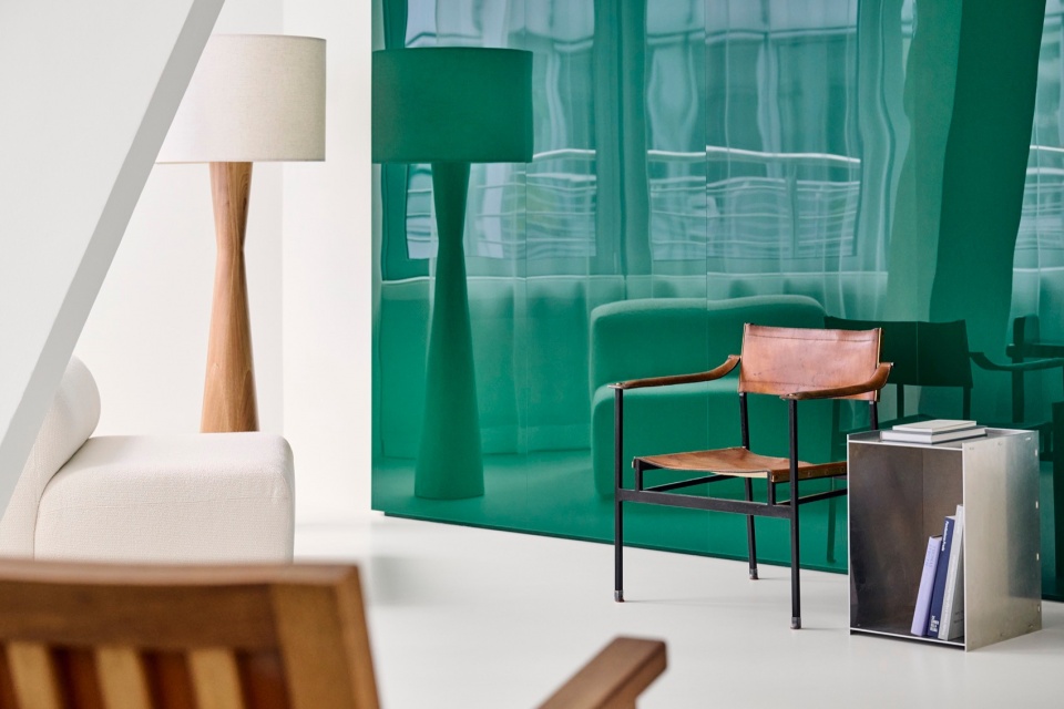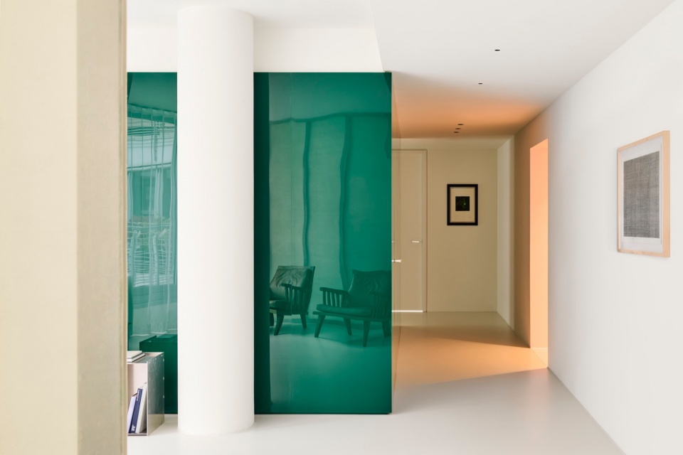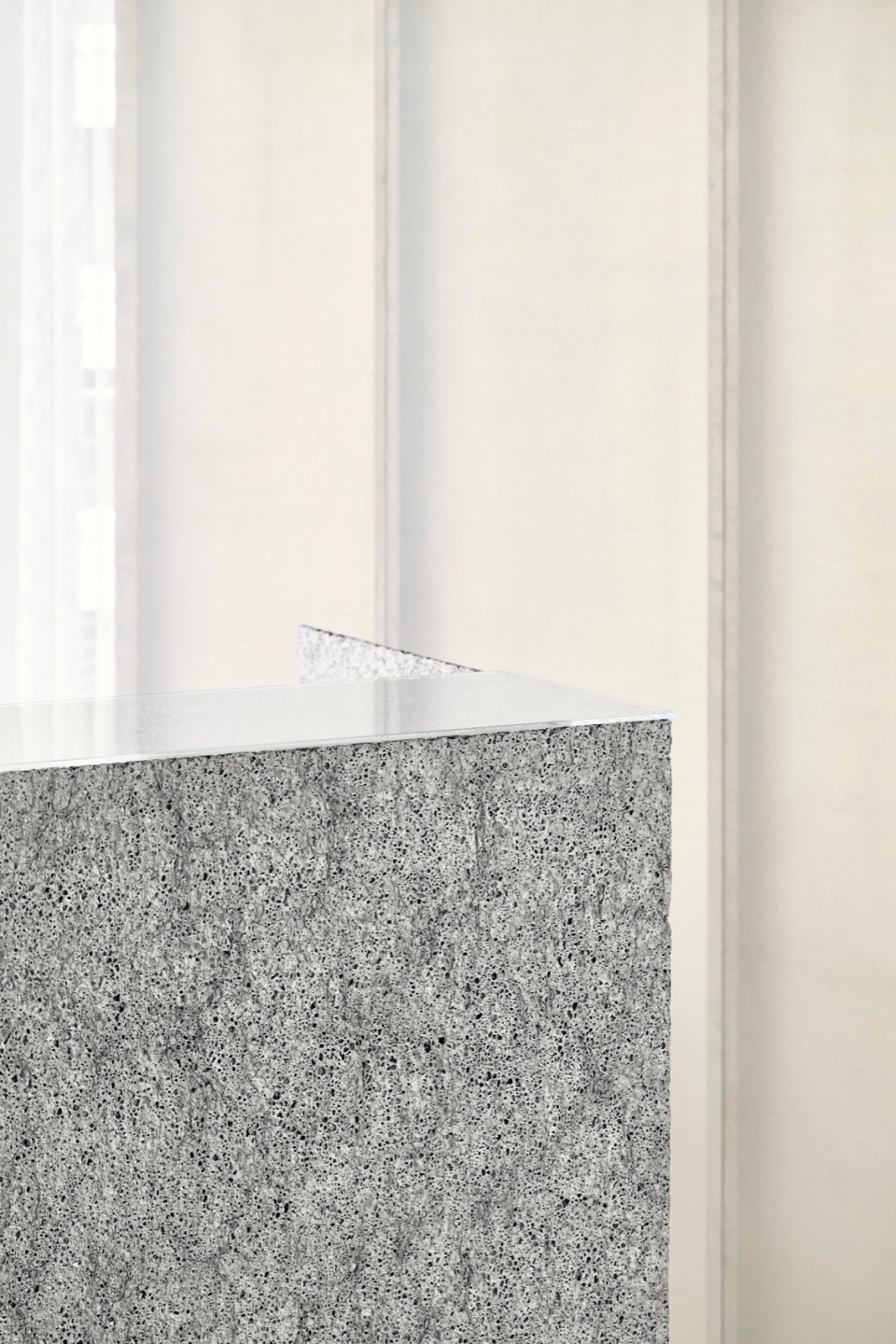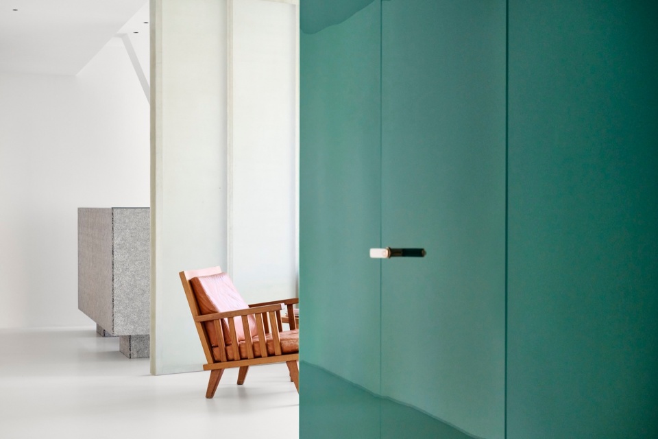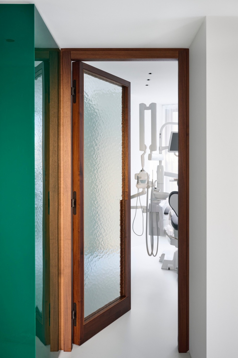 The doors to the treatment rooms are made of walnut wood and cathedral glass, which offset the otherwise cool, minimalist materials. The translucent quality of the unique glass conveys a certain openness without compromising the privacy of the patients. They also create a harmonious connection to the combination of new and old furniture in the waiting area.