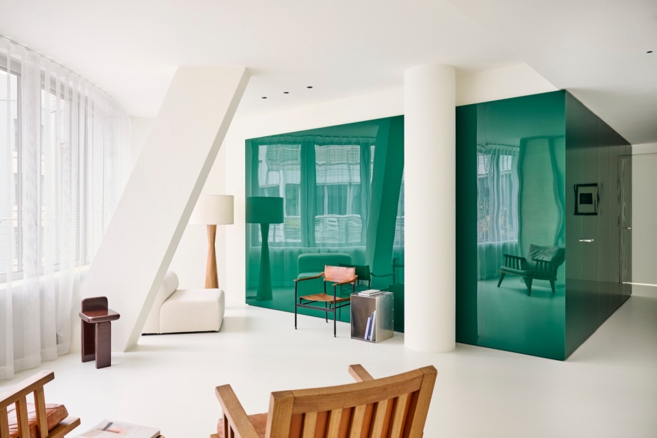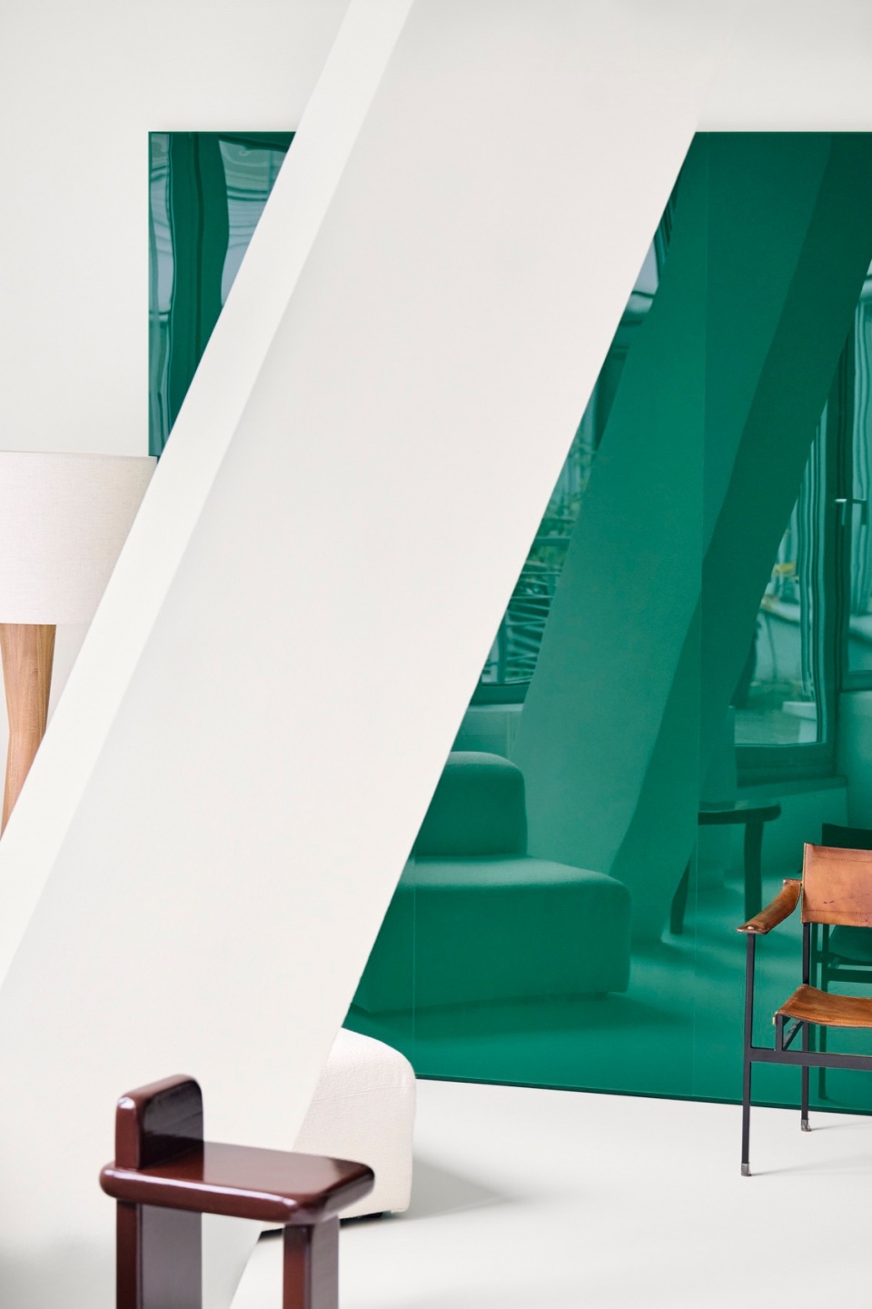 ▼绿色亚克力玻璃的立方体成为空间中的视觉焦点,the cube of green acrylic glass becomes the visual focus in the space