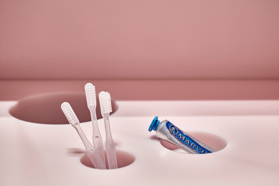 为了打破空间整体的协调与平衡感,设计团队将卫生间的地面、天花板、墙面及设备全部浸入粉红色之中。这一色彩从敞开的前室透入走廊,为空间带来一抹清新亮色。