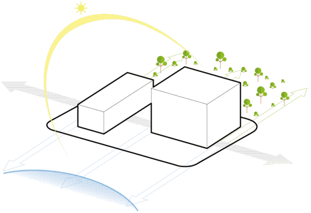 校区建筑的平面布局围绕着一个中庭展开,它也充当着垂直的光轴,通过教学空间楼层的光线反射,将自然光弥漫至室内。设计通过烟囱效应,促进整个空间的采光和通风,营造自然光线弥漫的学习殿堂。考虑到基地丰富的滨水自然资源,建筑师优化建筑朝向以最大限度地增加面向滴水湖及附近公园的景观视野。建筑体量的扭转和错层变化减少了其整体体积及对于周围街区的影响,顺应场地的同时在整个区域内形成具有识别性的存在。