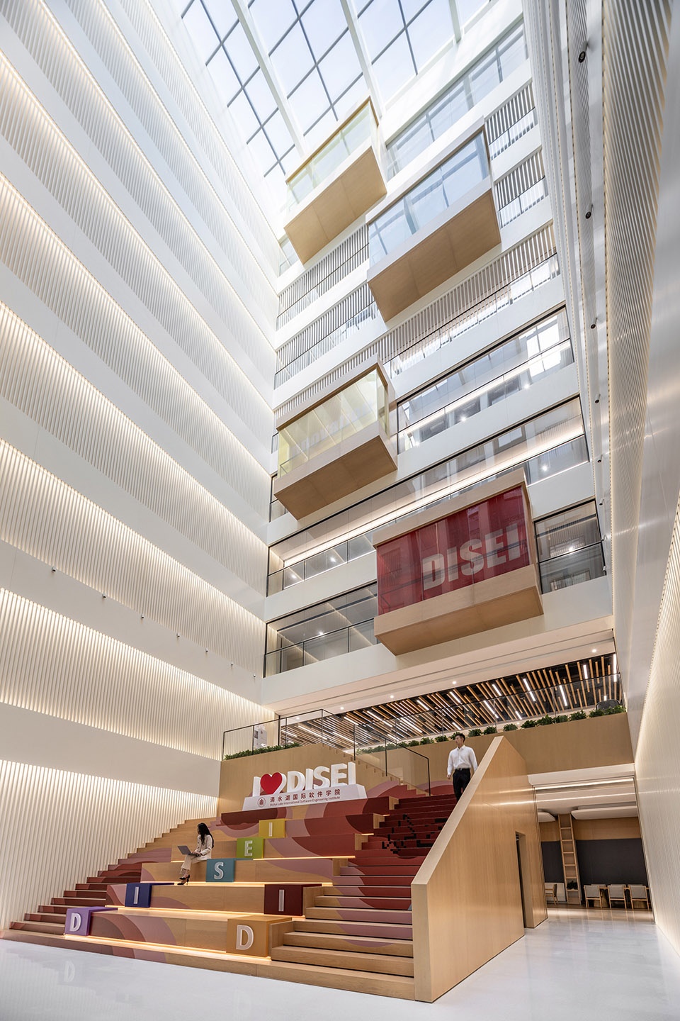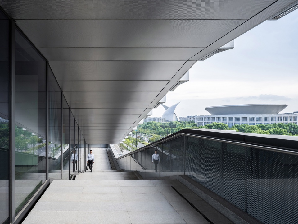 A cascading outdoor walkway embedded within the podium and academic building facades guides visitors upward, connecting rooftop terraces, indoor atriums, and spaces for rest, teaching, and meetings. Maximizing natural light, these stairways dissolve boundaries between floors, offering continuous open platforms for observation and interaction. The design introduces “interstitial spaces” that blur the lines between architecture and landscape, allowing the urban and natural scenery of Dishui Lake to permeate the campus.