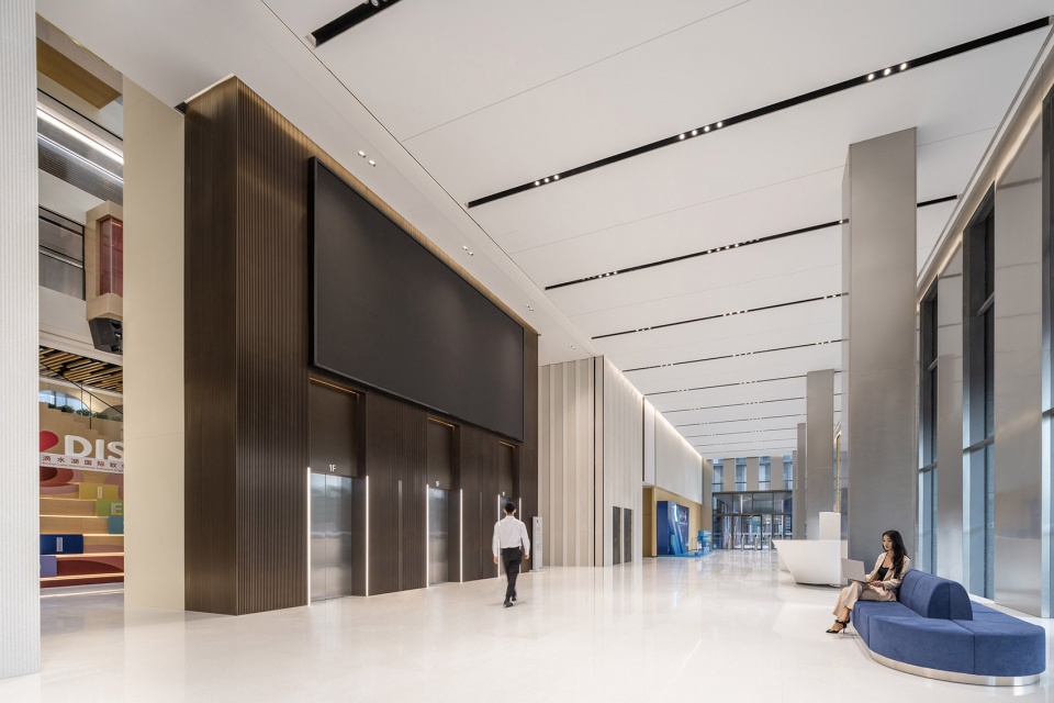 In contrast to the campus’s robust forms, the hotel tower is a sleek glass volume with grid motifs, balancing structural rationality with natural elements. Its rooftop platforms offer panoramic views of the lake and city parks. Folded walls optimize sightlines while creating rhythmic façades, and dark stone panels on the podium anchor multi-dimensional rooftop gardens.