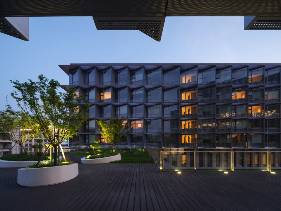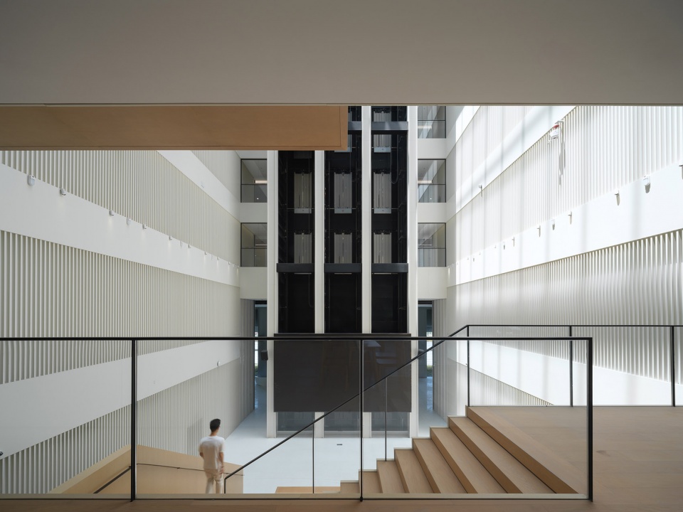 建筑师将体块整体抬升以获得更好的景观视野,在主体建筑中形成一系列的垂直庭院,平面布局围绕中央庭院展开。通过整合原有的办公、会议、交流空间,可在教学、会议、研发等场景灵活切换,满足本硕博师生不同教学组团对空间载体的需求,为产教融合的模式提供了有效的实践平台,激发师生的交流和创造力。