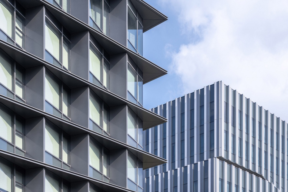 与体型较为庞大的校区空间形成鲜明对比的是,配套酒店的塔楼设计是一个富有网格元素,充满光泽的玻璃盒子。这种韧性与明度的相互作用形成一种张力,来自于整体结构的理性逻辑与自然元素的平衡。酒店的顶层包含两个屋顶平台,拥有滨水和城市公园等多样化的景观视野。折叠的墙体最大化地利用景观资源的同时又能形成一定的立面节奏,建筑低区裙房以深色的岩石面板突出,形成多维立体的屋顶花园。