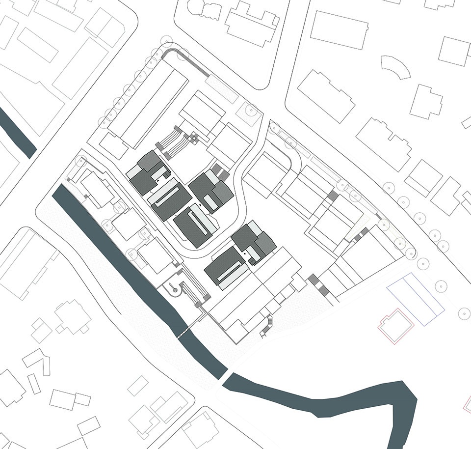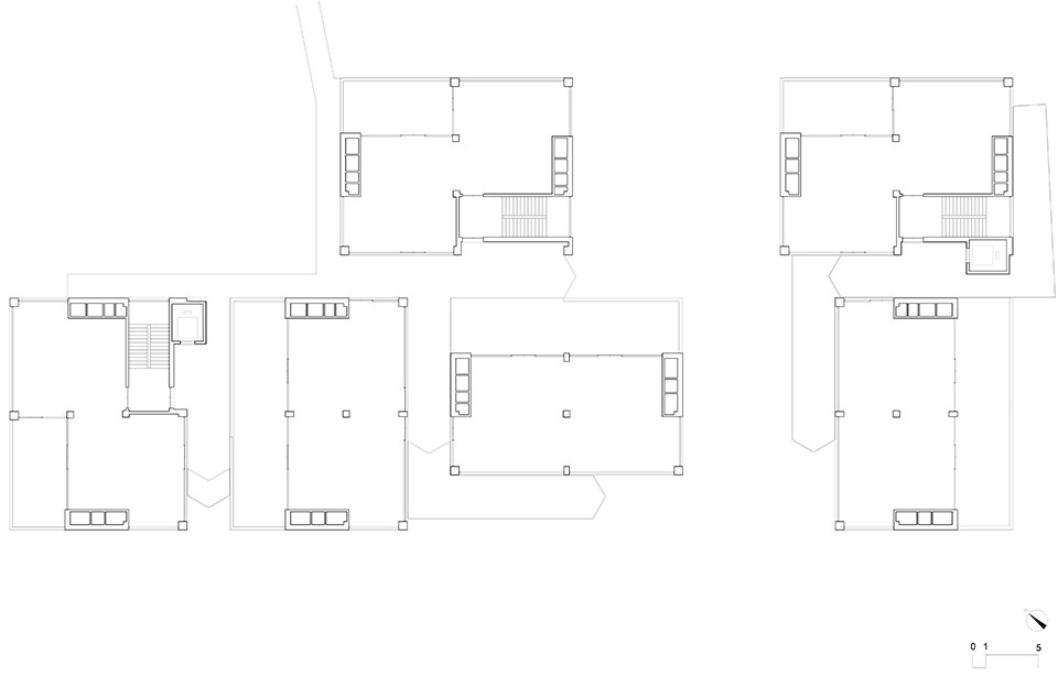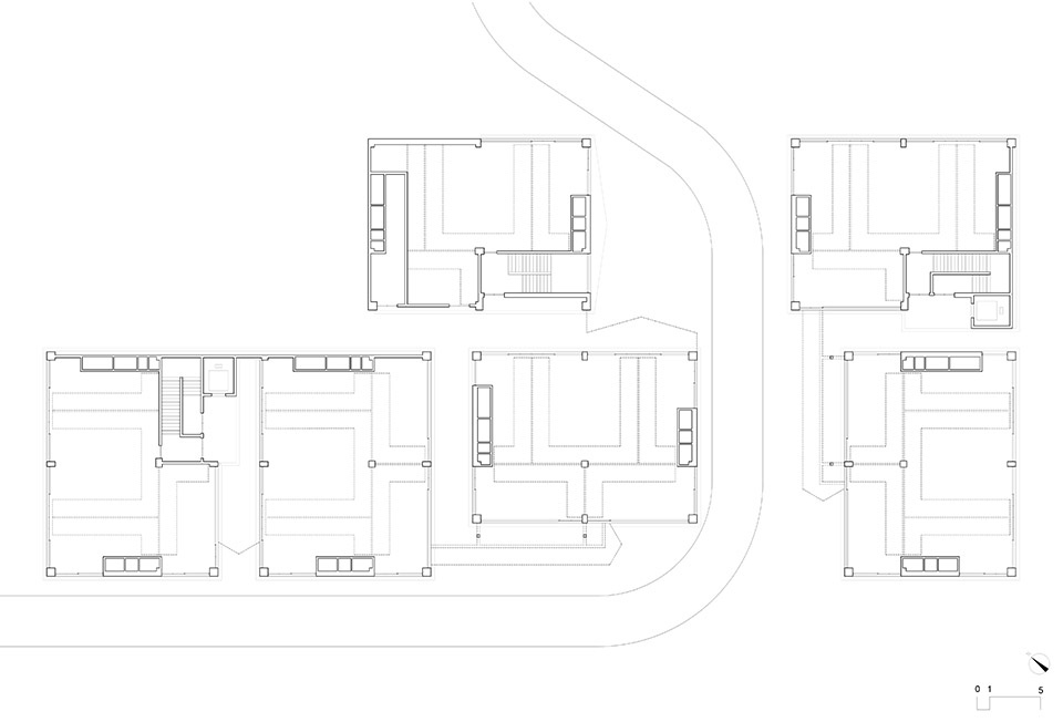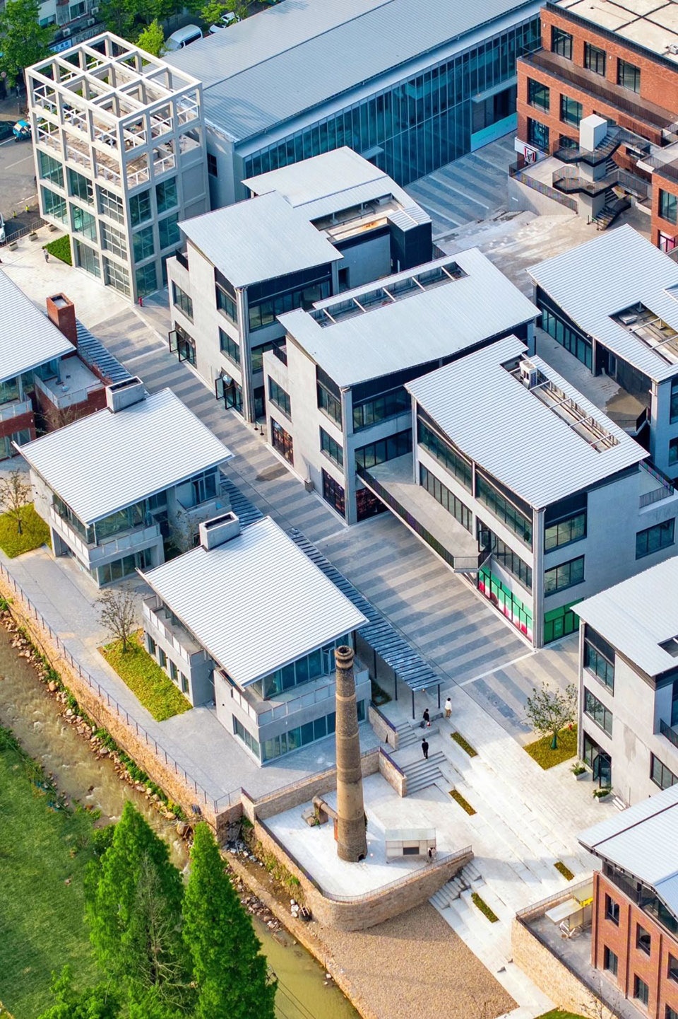 Located within the block formed by Huangfu East Road and Yuxin North Street in Moganshan Town, the Moganshan Multicultural Circle Module B Complex is a group of commercial office buildings for the M20 Commune developed by the Moganshan-Yu Street Project. The site was originally occupied by two factories, bordered with residential buildings to the east and Fuxi Creek to the south. The Moganshan Multicultural Circle Module B Complex consists of six two-and-a-half-storey buildings in the scale of 16.8×12.6m. It is divided into two groups: the four blocks on the north-western side are connected by a corridor, forming an inner plaza with the commercial buildings along the street and the public terrace, and facing the art gallery renovated from a factory building preserved on the site; and the two blocks on the south-eastern side are connected to the other factory building converted to be a Live-House. With the two converted factory buildings to the south and the north defining the original boundaries of the site, the Moganshan Multicultural Circle Module B Complex fills a total of about 4,200 square metres in between.