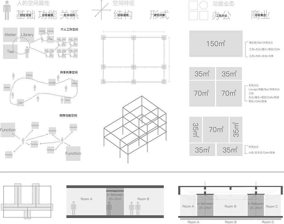 对商业模式和人的工作角色的观察让我们对未来的使用者和空间模式作出了假定。所谓多元文化圈的使用者可以与某个(些)组织共同工作/联合经商,也可以自我雇佣/独立开店。这些组织中配备了诸如茶水、卫生间、打印等基础设施,也保留了相应的介入空间:从一张桌子到分时段使用的可闭合隔间,再到一间完全独立的符合特殊功能的房间。无论这些使用者是各自租下店面,保留接纳另一个使用者的扩展可能性,还是合租下一整栋,再进行内部划分,基础设施叠加三种介入空间的方式都将成为共享的结构,与8.4m的柱网一起限定建筑空间的组织。