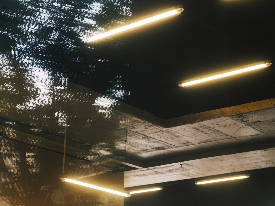 ▼吊挂板、玻璃、灯光和树影相互映衬,Hanging panels, glass, light and shade against each other