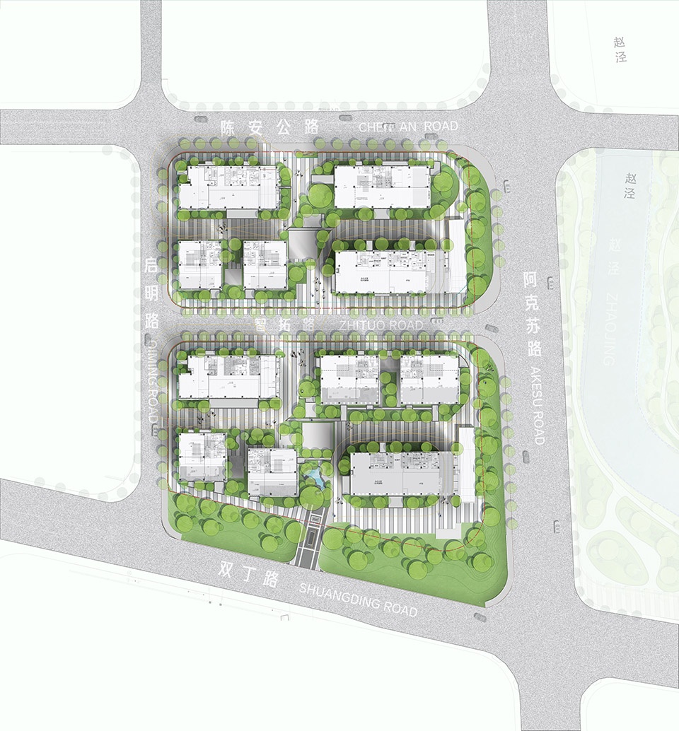 The north and south plots of the project are composed of 11 building boxes of block scale, with different heights and rich layers, forming an organic space.