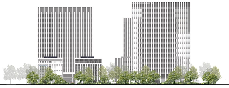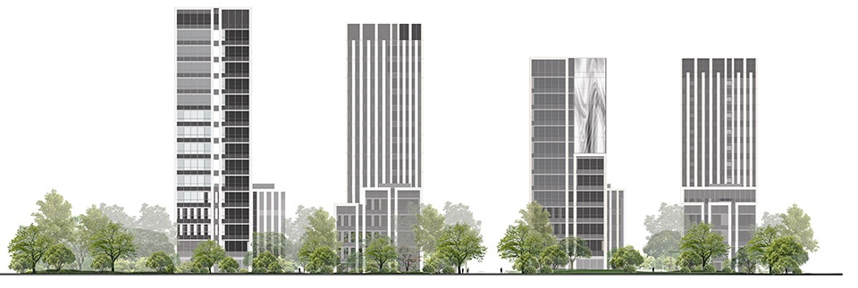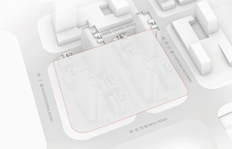 项目南北地块由11栋建街区尺度的建筑盒子组成,高高低低,层次丰富,形成有机空间。南北地块内各有两栋高层建筑于西北和东南呈对角布置,保证塔楼都拥有较为开阔的空间视野。