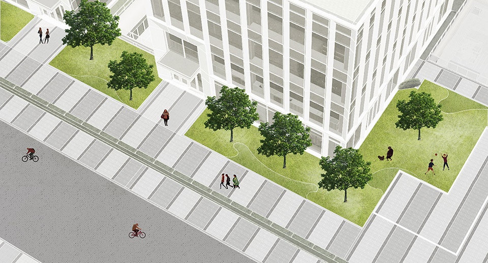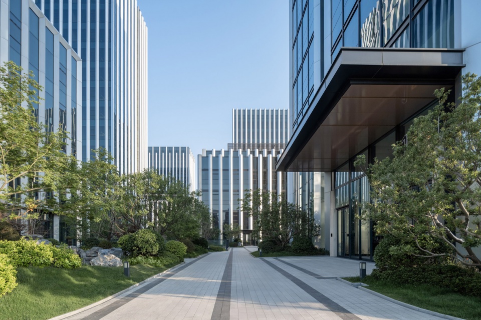 在地面关系中,建筑与建筑之间形成不同尺度的街区广场,街区横向链接东西界面及办公楼出入口空间,街区纵向延伸形成轴线,串联各个街区的同时,利用铺装引导形成一条便捷的开放路径,链接南北两个地块。