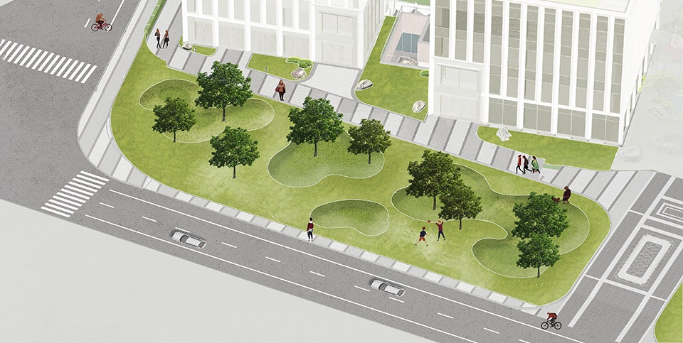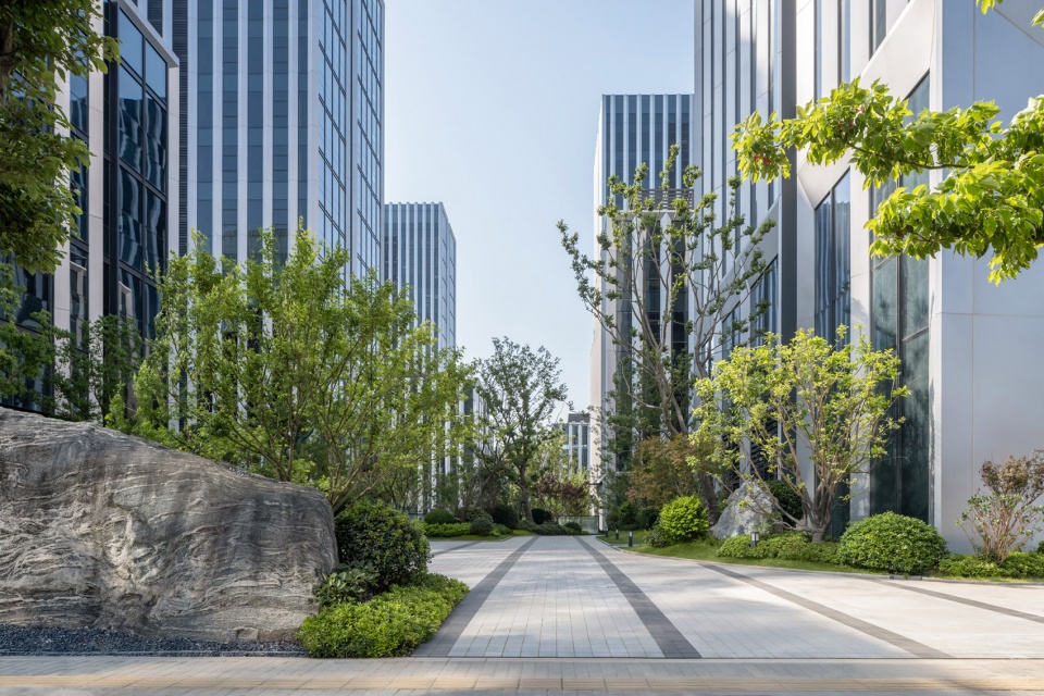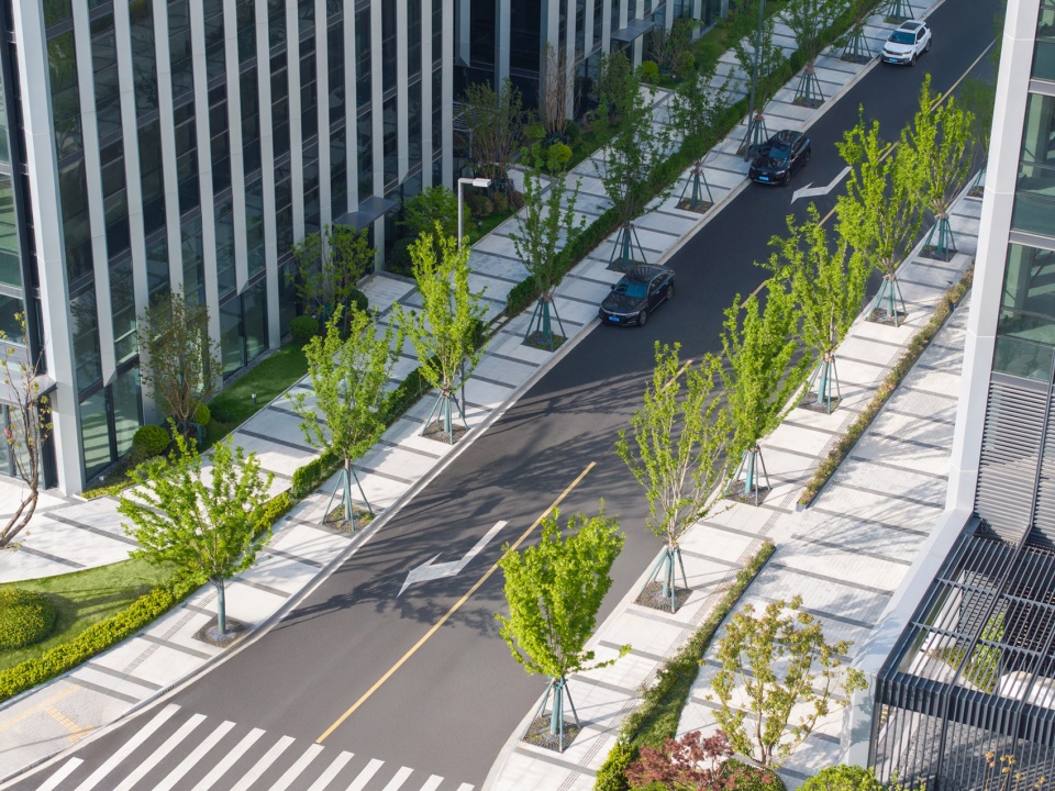 商办园区南侧双丁路环抱野生香樟林带,在城市交界处形成天然绿色背景。设计结合市政绿地渗透园区内部,利用微高差递进景观模糊内外的边界,使市政空间与界面空间共融链接,无明显的界限之分,增强公共属性。
