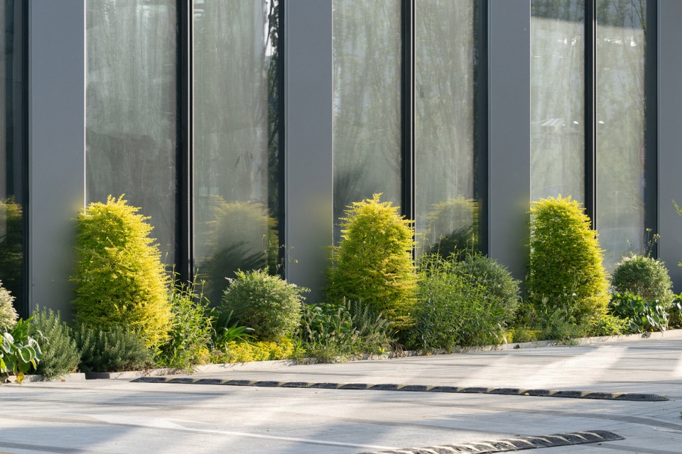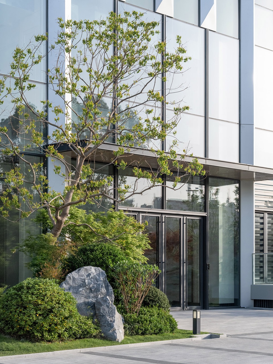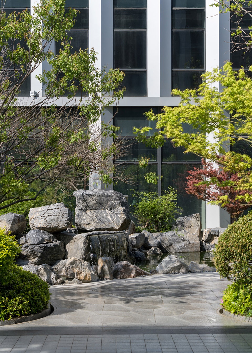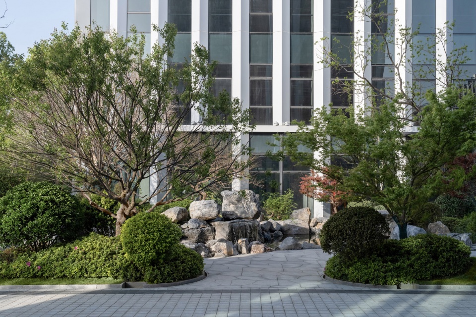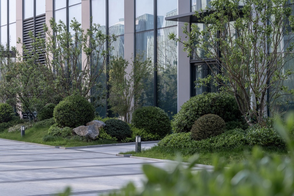 In terms of design style, we have integrated elements of modern simplicity and natural ecology. By ingeniously combining micro-terrain landscape stones as embellishments with evergreen tree species, we have created a unique space that not only conforms to the modern business atmosphere but also retains the beauty of nature.