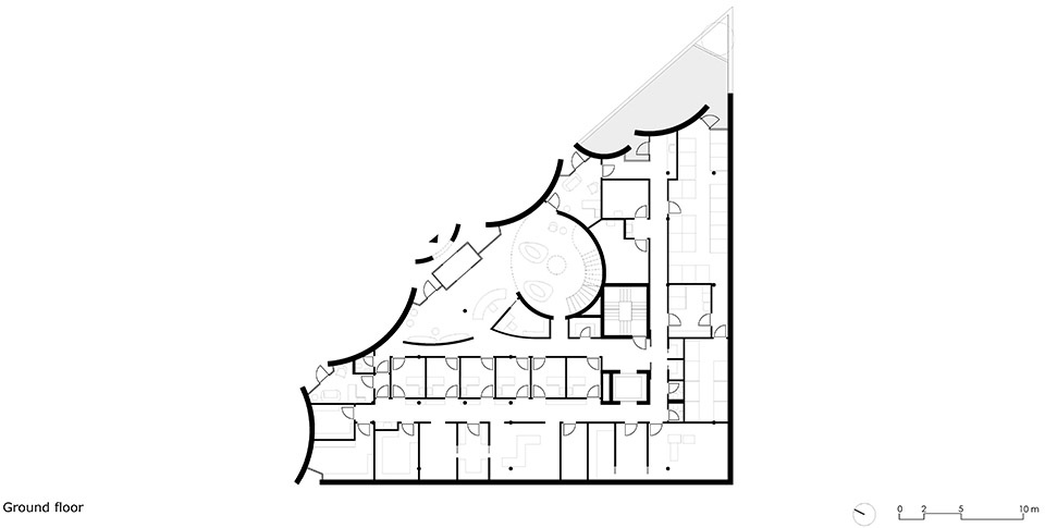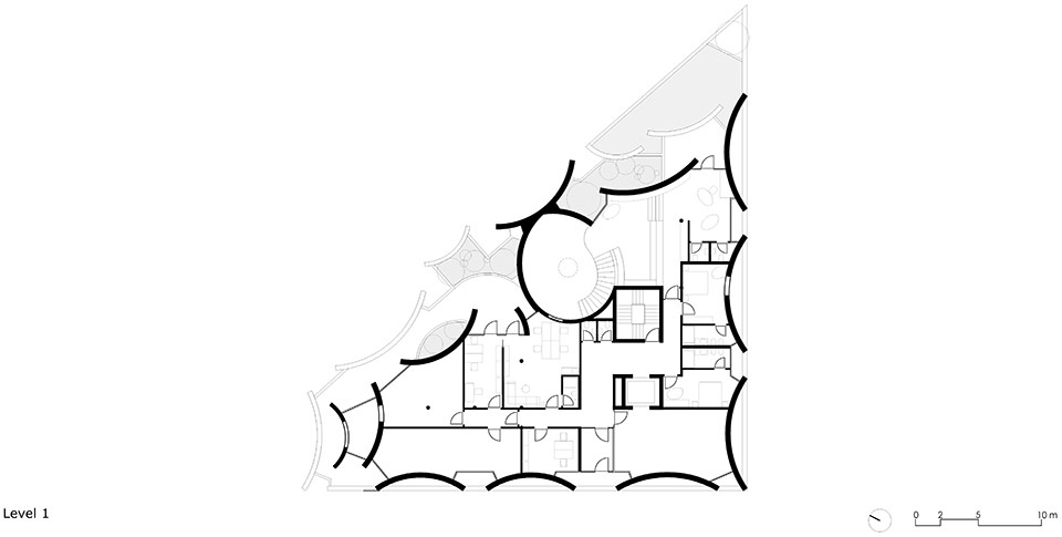 这一理念在地拉那的兽医医院项目中得以具象化。激情、热情与远见被转化为一个具象空间。医院柔和流动的外部形式,与平面布局的理性逻辑形成对比,营造出一种奇妙与和谐共存的氛围。最初看似简单静态的几何形体——植根于空间心理与人类学原则——逐渐展开为一个充满动感的曲线网络,使这里成为一个真正的“场所”,充满生命与流动感。这些流线型的形式消除了人们对封闭空间的原始恐惧,营造出一种开放而自由的环境。