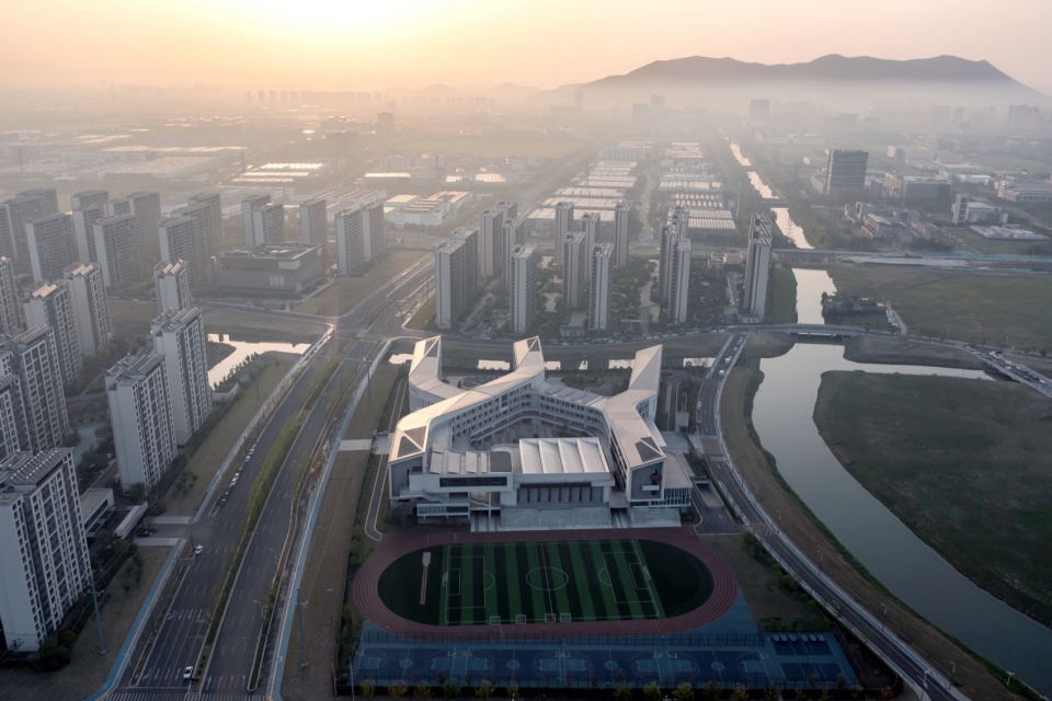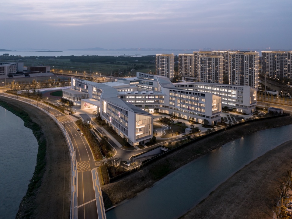 南京大学苏州附属小学坐落于苏州市高新区科技城教育核心地带,是南京大学东片区延伸科技创新链条、构建研学产业枢纽的关键一环,于2024年9月正式投入使用。基地坐拥’太湖西枕、群山东望’的绝佳景观格局,东南两侧被两条蜿蜒的河道环抱,自然资源丰富。地处山水之间得天独厚的自然优势,让设计着重思考如何摒弃传统小学“过度强调效率”的旧有模式,进而打造一个融于自然、环境育人、开放包容且空间布局灵活的新型校园综合体,并以多种绿色建筑技术打造韧性校园,以适应新时代的教育需求。