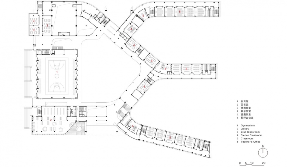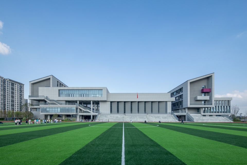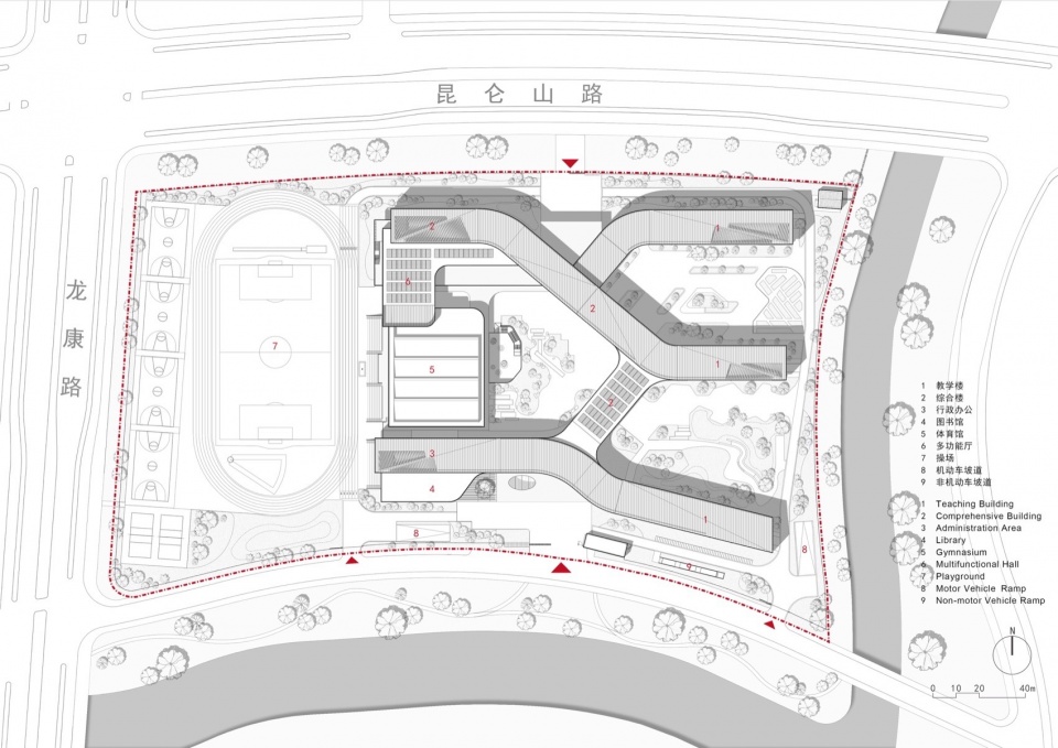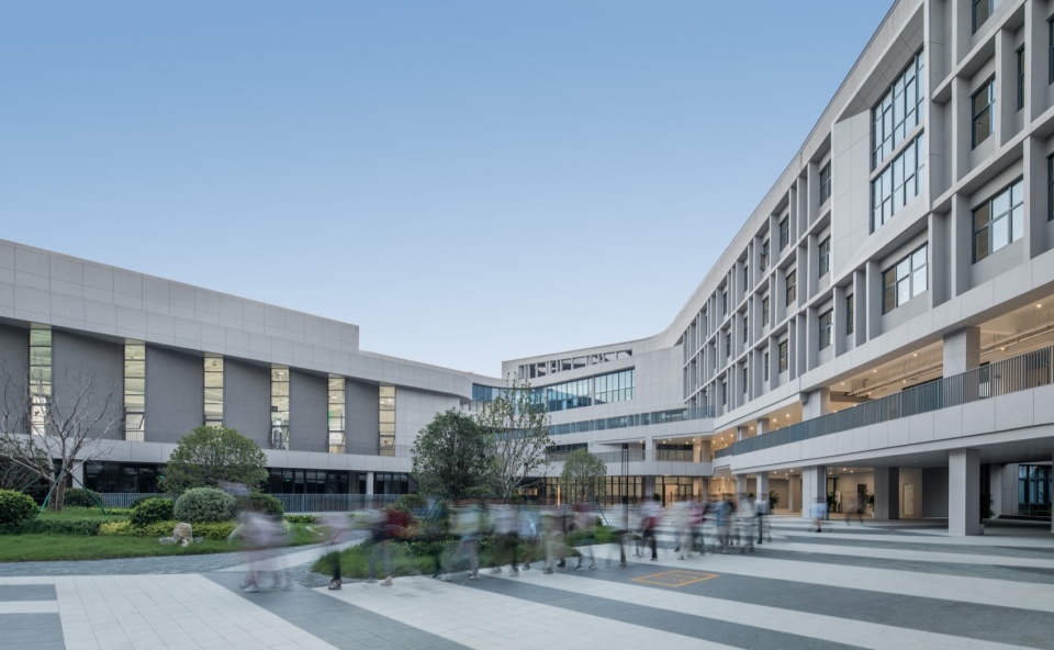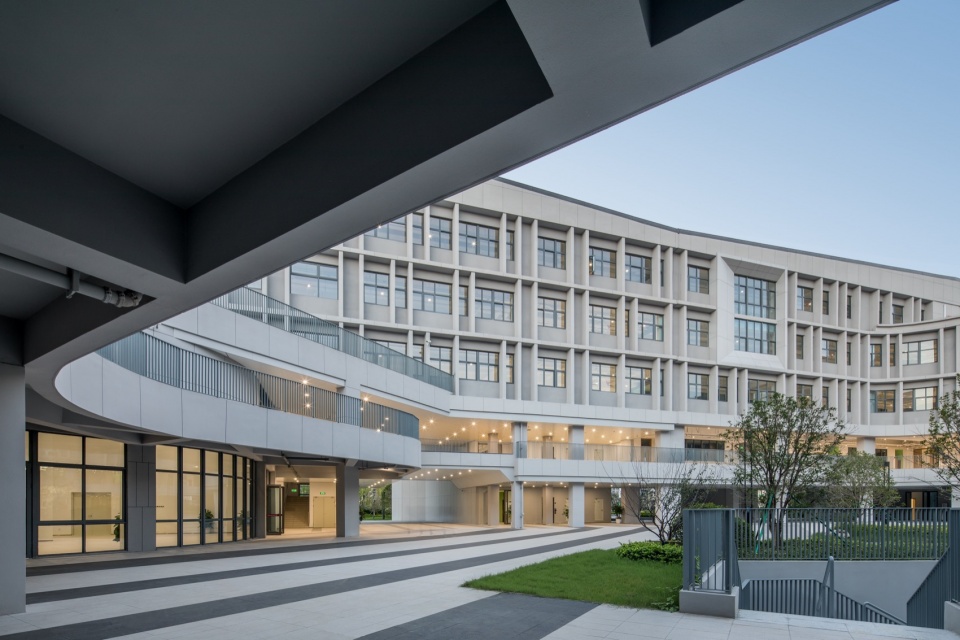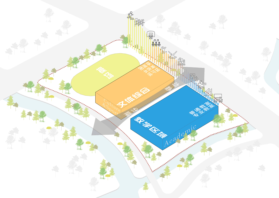 In order to intensively and efficiently utilize the site, based on the concept of “five minute reach circle”, multiple functional rooms and activity spaces are designed to be stacked in a three-dimensional manner. The main function of the western building block is focused on the core public activity area of the school.