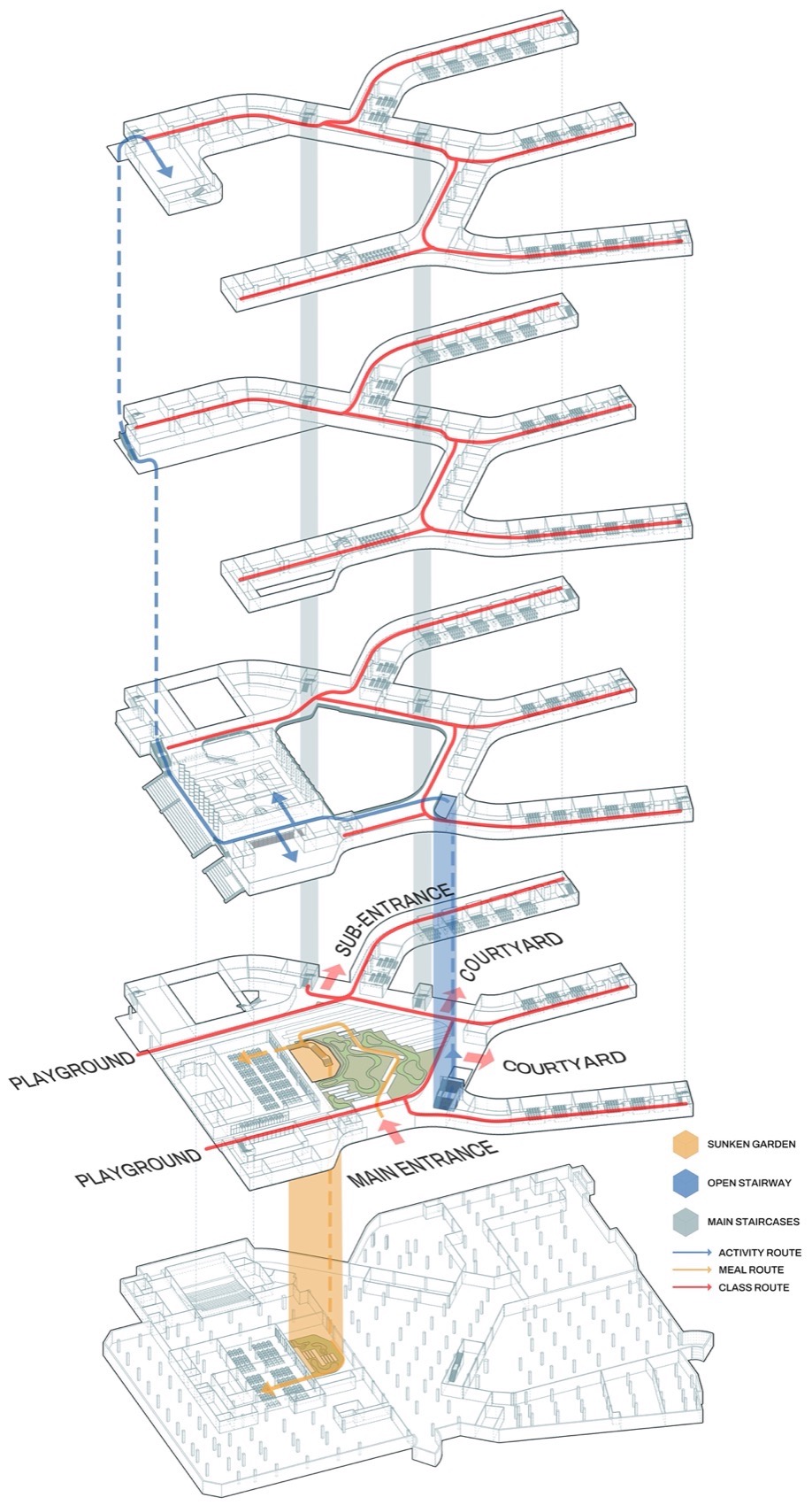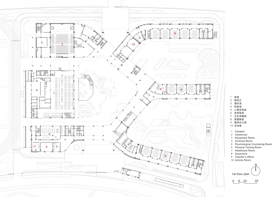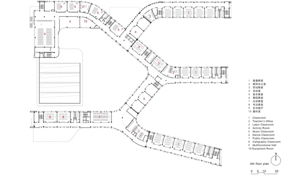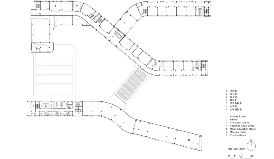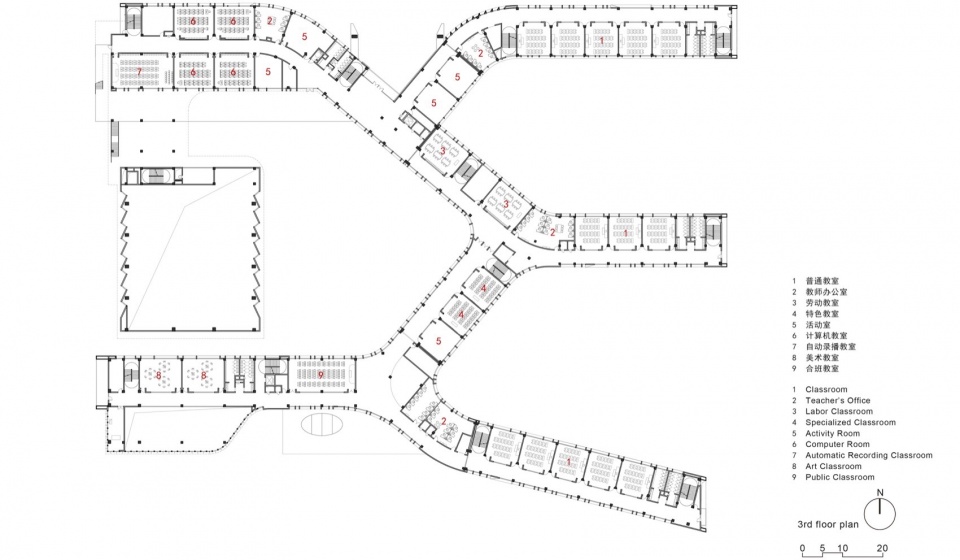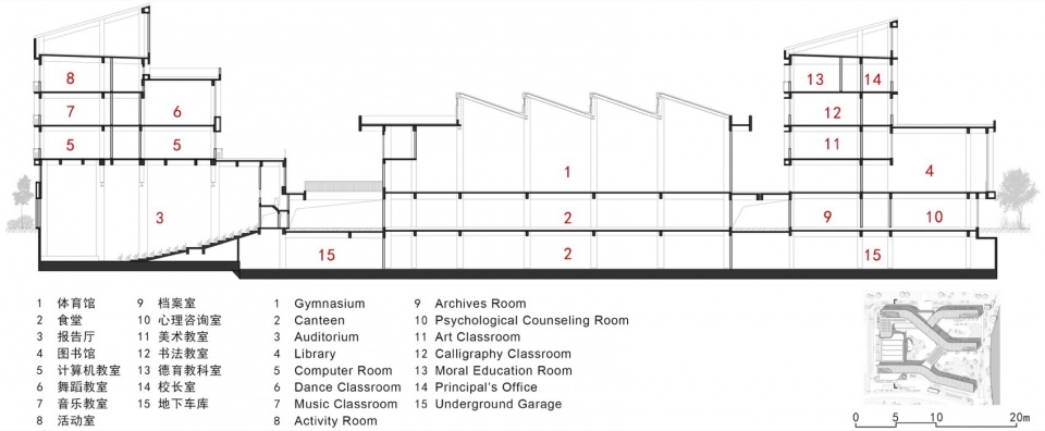In order to intensively and efficiently utilize the site, based on the concept of “five minute reach circle”, multiple functional rooms and activity spaces are designed to be stacked in a three-dimensional manner. The main function of the western building block is focused on the core public activity area of the school.