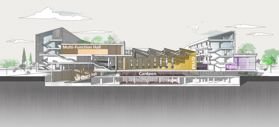 ▼校园西侧公共活动组团剖透视图,Sectional perspective view of the public activity group on the west side of the campus