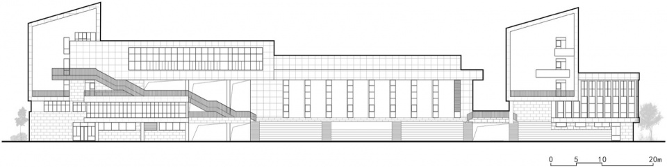 Breaking through the inherent mode of functional zoning, creatively placing the cafeteria at the heart of the building complex – not only as a physical hub, but also as an energy field for daily communication between teachers and students. Due to the excavation of a sunken courtyard on the east side of the negative first floor cafeteria, this dining space surrounded by a sunny courtyard naturally extends upwards to the suspended sports hall through staggered platforms and outdoor stairs. The sports hall is located above the cafeteria and features an openable glass ceiling. On sunny days, sunlight pours down, providing good natural lighting and ventilation for the sports space. The library, as a knowledge lighthouse, is carefully placed at the best viewing position facing south. In order to provide a better indoor lighting environment, the south facade is constructed with folded perforated metal panels as external shading, becoming an intelligent shading system that filters strong sunlight. Readers can enjoy the river landscape through french window at any reading corner, while the reading cabin extended from the second floor provides children with a private learning space full of childlike fun. Two large conference spaces in the school are located in the northwest corner, one is a stepped lecture hall that runs from the basement to the second floor, and the other is a multifunctional hall located above the lecture hall. The lecture hall cleverly utilizes the height difference of the terrain to embed the audience seats into the building base, and its roof forms an open-air theater. Two outdoor stairs provide convenient access to the multifunctional hall located on the fourth floor, forming a vertical axis with the multifunctional hall above.