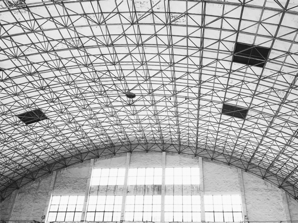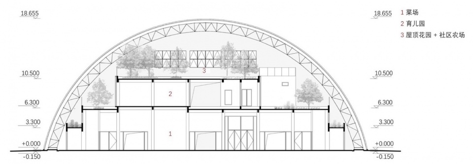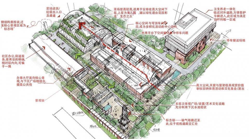 D1厂房(零件库):经过结构检测鉴定,零件库网架节点螺栓连接牢靠,部分构件及涂层存在锈蚀现象。但是彩钢板屋面年久失修,漏水严重,已经无法作为建筑围护物来保留。我们拆除了彩钢板屋面层,保留了最具特色的“拱形曲面网架结构”。为表现网架结构三角锥形的单元特征,我们在网架上安装了三角形的膜材料装置——“飞鸟”,像一群小鸟“飞翔”在拱顶上。在网架内,我们重新搭建了空间:社区菜场设置在底层,适当的空间高度减少了菜场运营的空调负荷;在菜场上层设置了社区农场和育儿园,形成一个绿色的“生态之丘”。平台上还设计了天窗,给菜场引入自然光线的同时也给上层的孩子们创造一个观察菜场活动的小窗口。