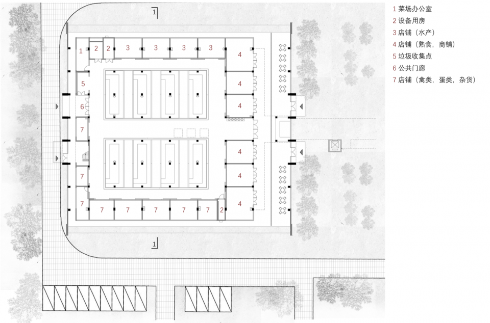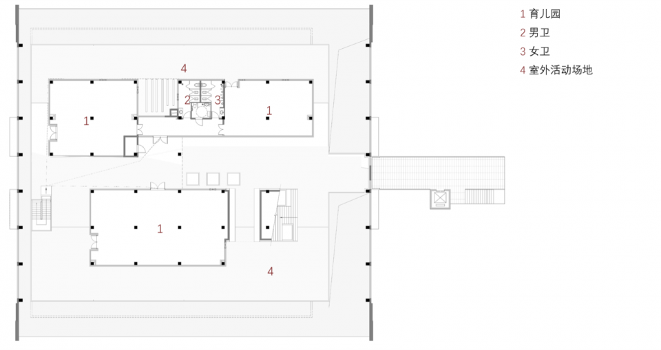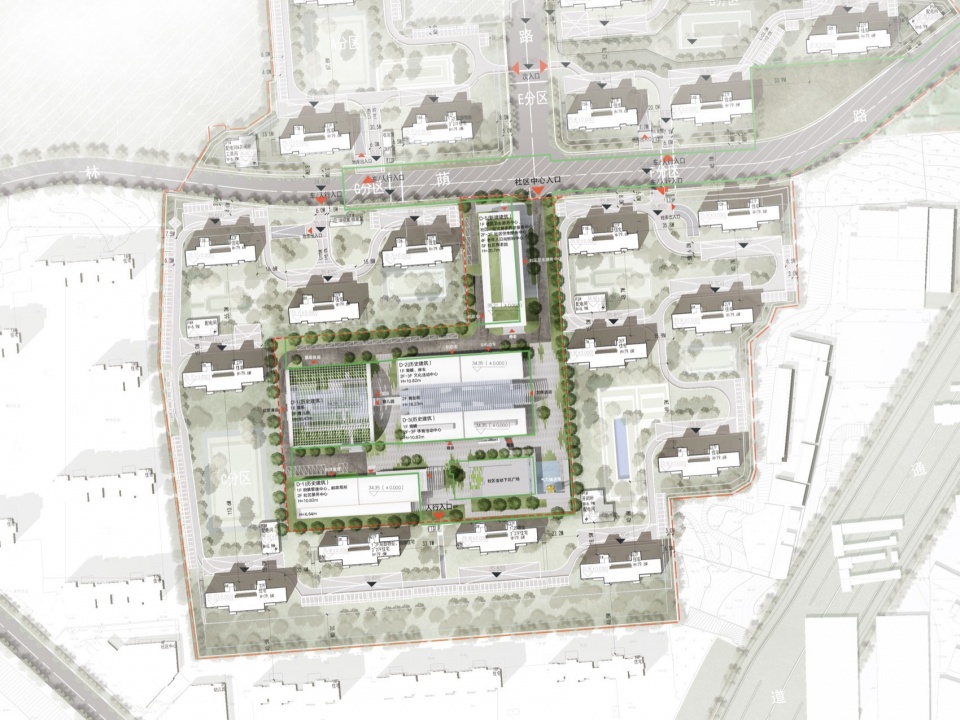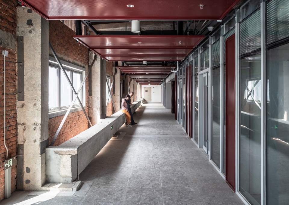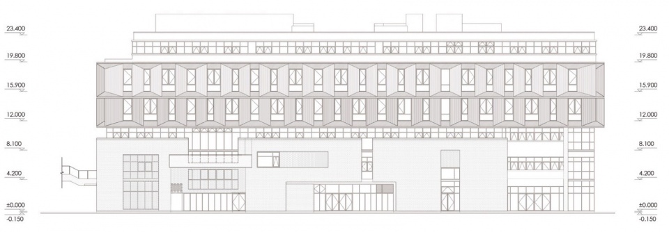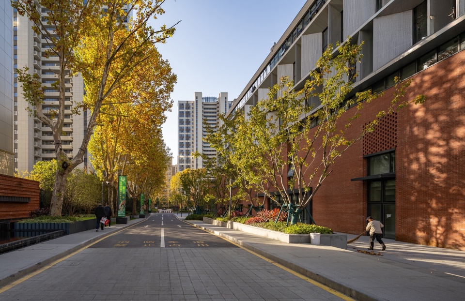 The newly built part uses steel structure, completely separated from the original concrete structure of the factory building. The easy disassembly feature of the steel structure also ensures the reversibility of the renovation process. The community hospital and elderly care service center (newly built): This building consists of a community hospital and an elderly care service center, with strict functional requirements that make it unsuitable for renovation of the old factory buildings. It can only be located in the only area within the site that meets the sunlight requirements and allows for new construction. The first to third floors are the community hospital, featuring a red brick facade approximately 12 meters high, matching the height of the factory building to the south; the fourth to sixth floors are the elderly care service center, with a facade of glass and silver-gray perforated aluminum panels, creating a simple and light appearance that reduces the volume. Thus, along the tree-lined avenue, the entire building complex presents a coherent visual effect.