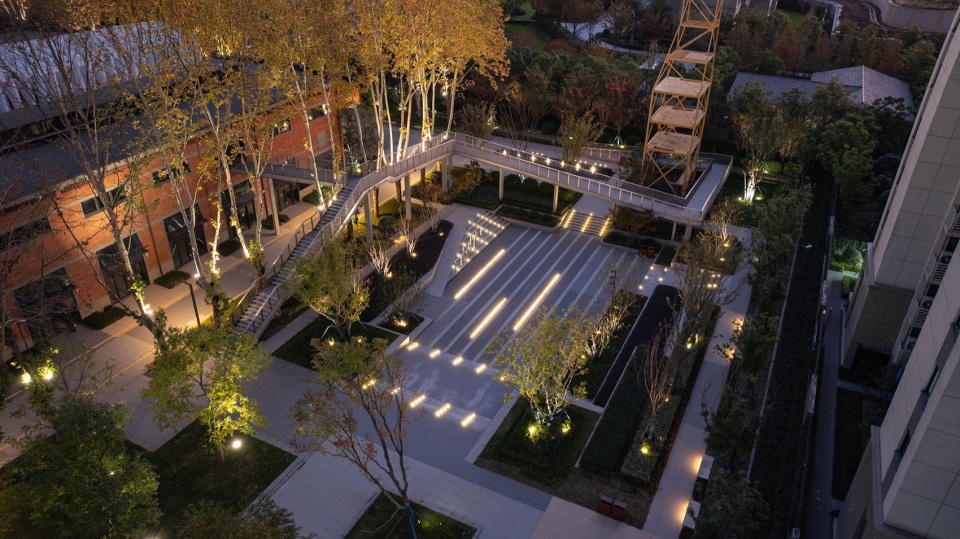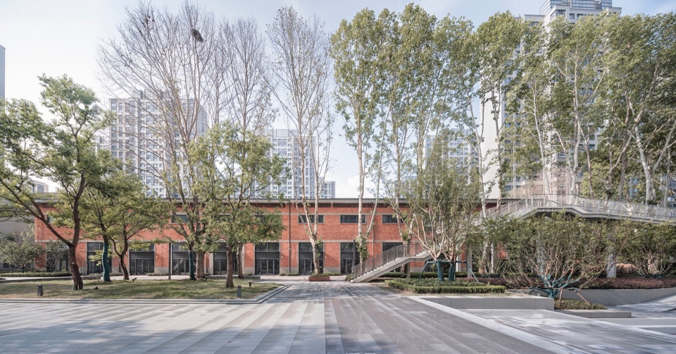 Initially concealed, the steel pneumatic conveying tower was relocated to the front of the sunken plaza’s water feature after structural reinforcement and renovation. Positioned at the end of the main entrance axis, the new “pneumatic conveying tower” now serves as a prominent landmark. A pedestrian bridge, bypassing the pneumatic conveying tower, connects various factory buildings and links all public activity areas in the community center. We also surveyed and documented the trees along the tree-lined roads, ensuring their adequate protection.