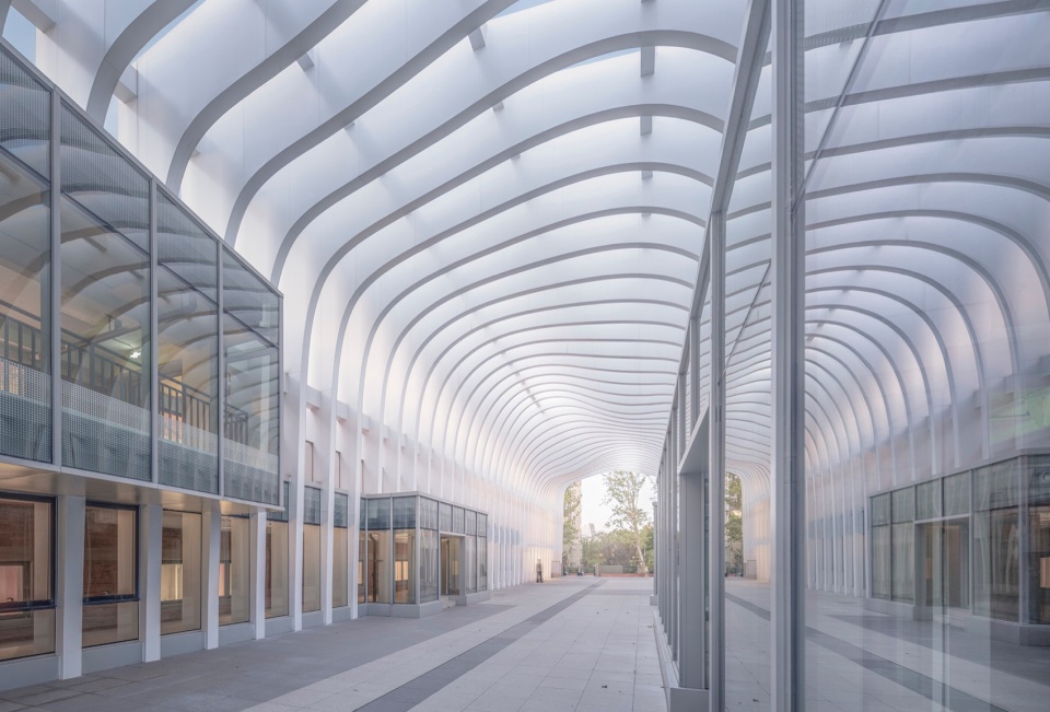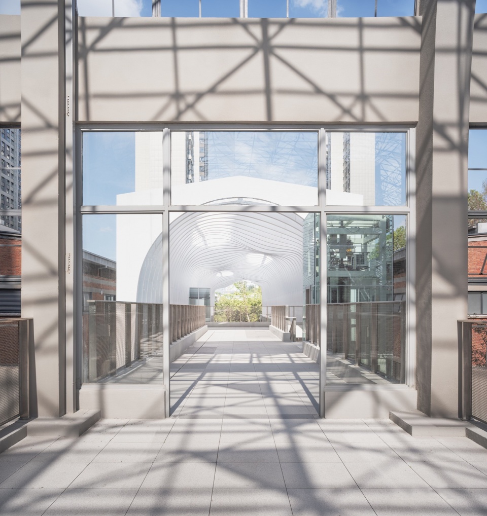 “Cloud Shadow” corridor: The “Cloud Shadow” space is a long corridor serving as the core axis of the building complex and connecting community cultural, sports, commercial, market, and nursery functions. After multiple rounds of scheme comparisons, we chose a strategy of light intervention between the old factory buildings, aiming to create a sharp contrast with the practical and sturdy architectural character of the original industrial buildings through a “foreign element” with a strong sense of contrast. “Cloud Shadow” is composed of a row of white frames, with a V-shaped outer contour echoing the frame structure of the two factory buildings on either side, and the arc-shaped negative space of the frames echoing the circular arch shape of D1 factory building at the west end of the axis – thus ingeniously responding to two important elements of the surrounding factory buildings. The continuous white frames are inserted between the two industrial relics, with undulating internal surfaces and changing light and shadow creating a hazy and pure effect, as if cloud shadows were floating in the air.