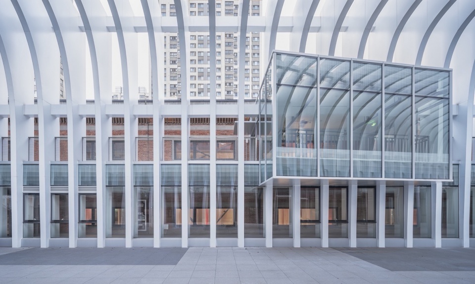 ▼白色构架插入两栋工业遗迹之间,The continuous white frames are inserted between the two industrial relics