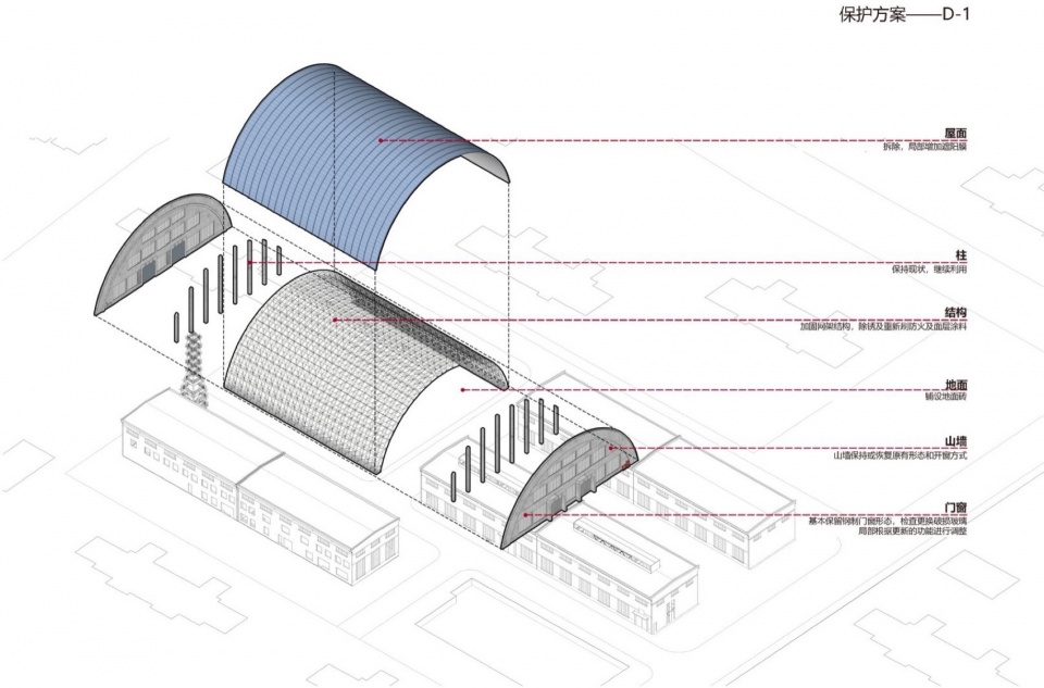 The site is encircled by residential areas, with only one area in the northeast corner accessible to urban roads, featuring a small plot for new construction. Within the site, four factory buildings, two structures, and a green avenue preserved since the initial construction phase are currently maintained. The protected elements include: three factory buildings with reinforced concrete bent structures; A parts warehouse, the first industrial building in China with an “arched curved grid structure,” boasting a distinctive 2300 square meter column-free space; The pneumatic conveying tower and circulating water pool are also significant relics elements of the production process information.
