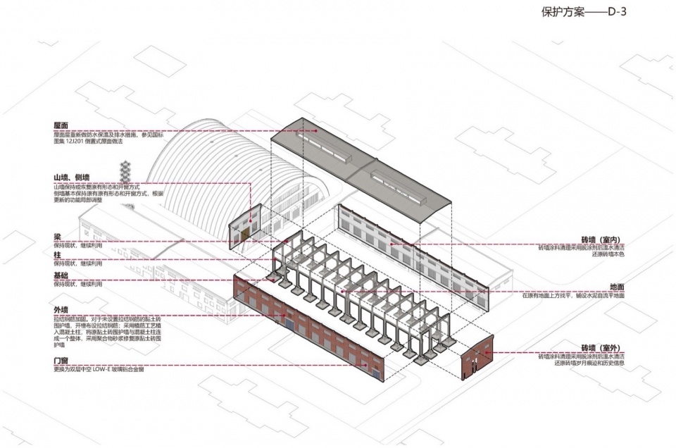 Safety, authenticity, and reversibility are the three principles in the protection of industrial heritage: ensuring the structural safety of historical buildings, preserving and restoring their original style and characteristics, and completely separating newly constructed steel structures from the original concrete structures of factories to ensure the reversibility of the renewal process. Firstly, we numbered each of the existing industrial heritage elements, conducted surveys and structural appraisals, and provided corresponding evaluation conclusions.