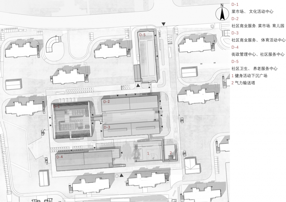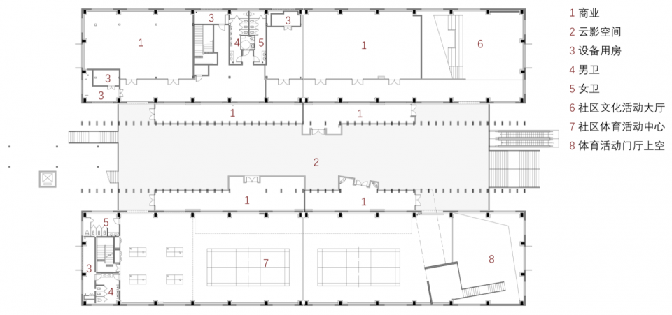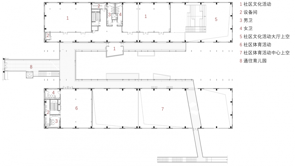 D2和D3厂房:建筑空间高达11.6米,天窗和屋架极具工业结构的美感。我们在厂房内局部搭建了3米高的钢结构平台,平台下空间做车库。平台上开放空间为社区文体活动区,其中一部分空间保留8.6米高度,可以容纳球类运动;其他部分则增设楼板,分隔成两层,容纳文化活动。D4厂房:功能为社区的街道办公,相对内向。办事大厅部分面向广场,提高公共性和可达性。