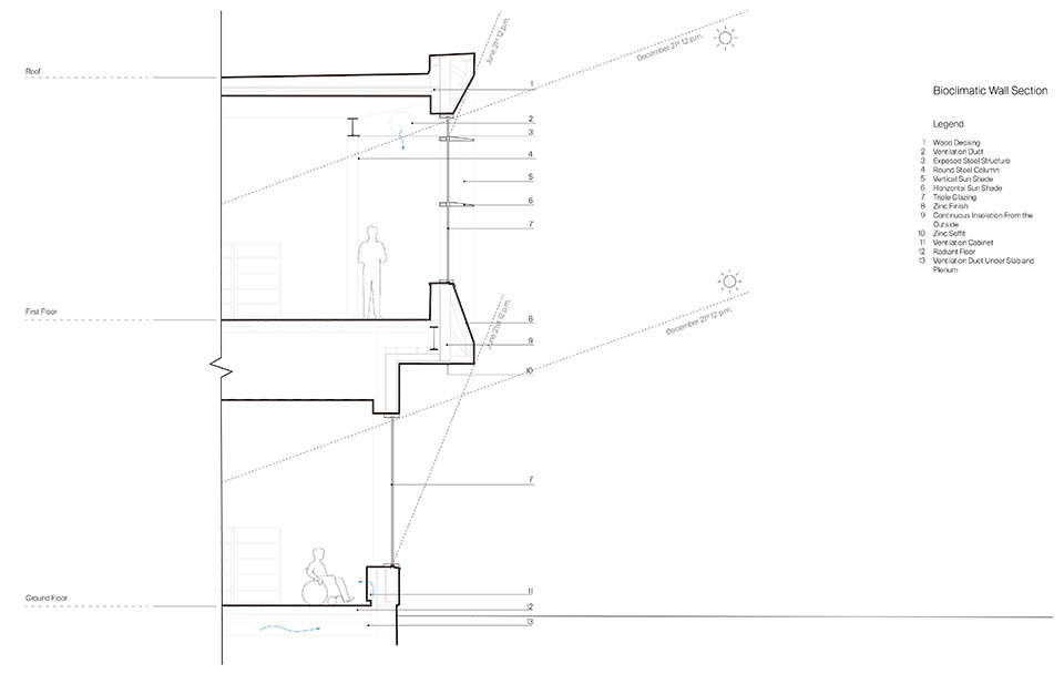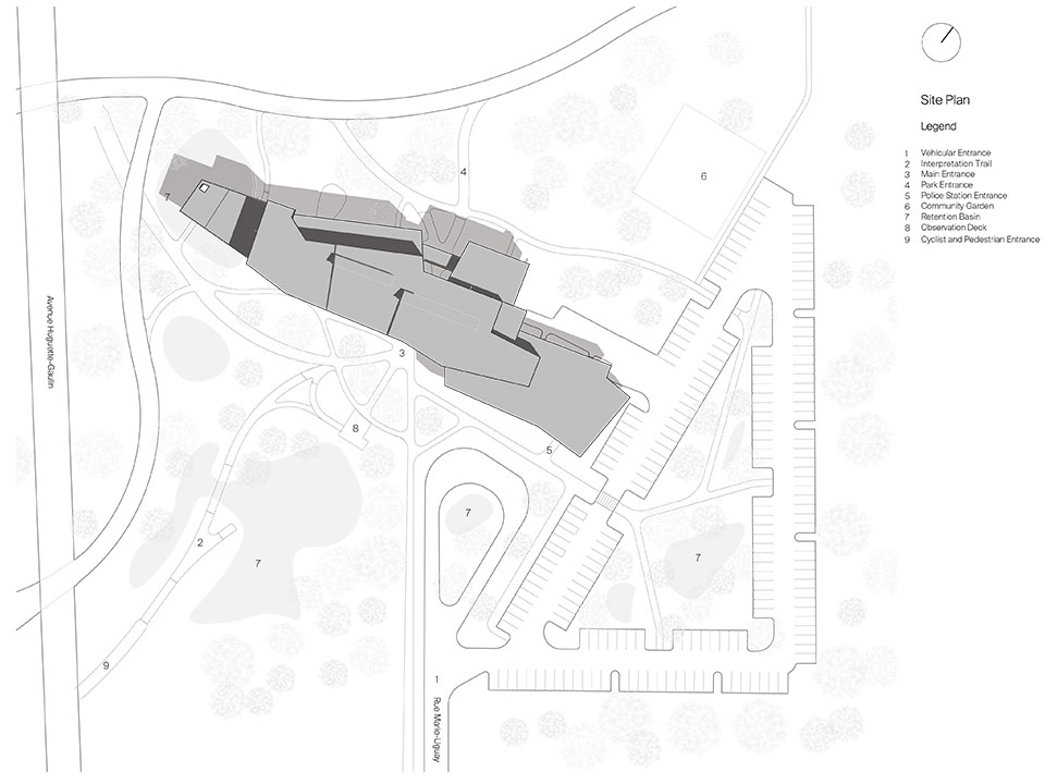 建筑在广阔未开发用地上的布局,使其可沿东西向轴线布置,从而最大程度提升生物气候效率。通过采用朝南立面设计,修长且倾斜的体量形式有助于被动式太阳能获取,同时减少东西立面带来的热负荷。这种布局不仅提升了热舒适性与能源表现,同时也令该建筑在Huguette-Gaulin大道上一目了然,成为显著地标。