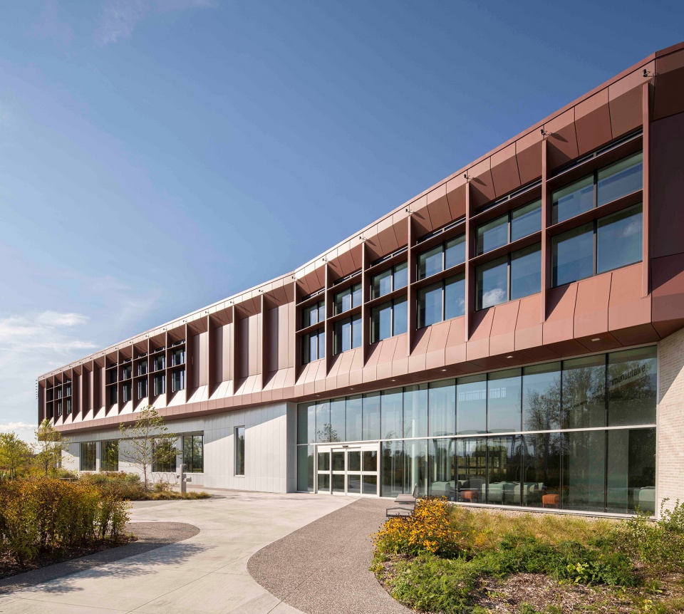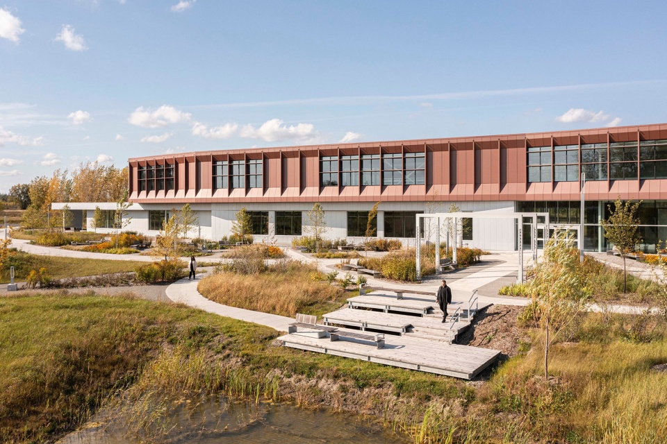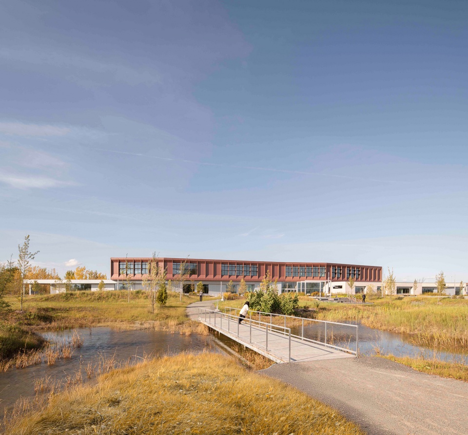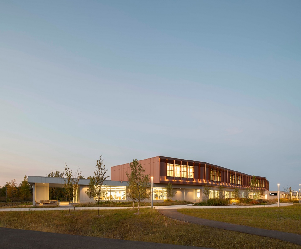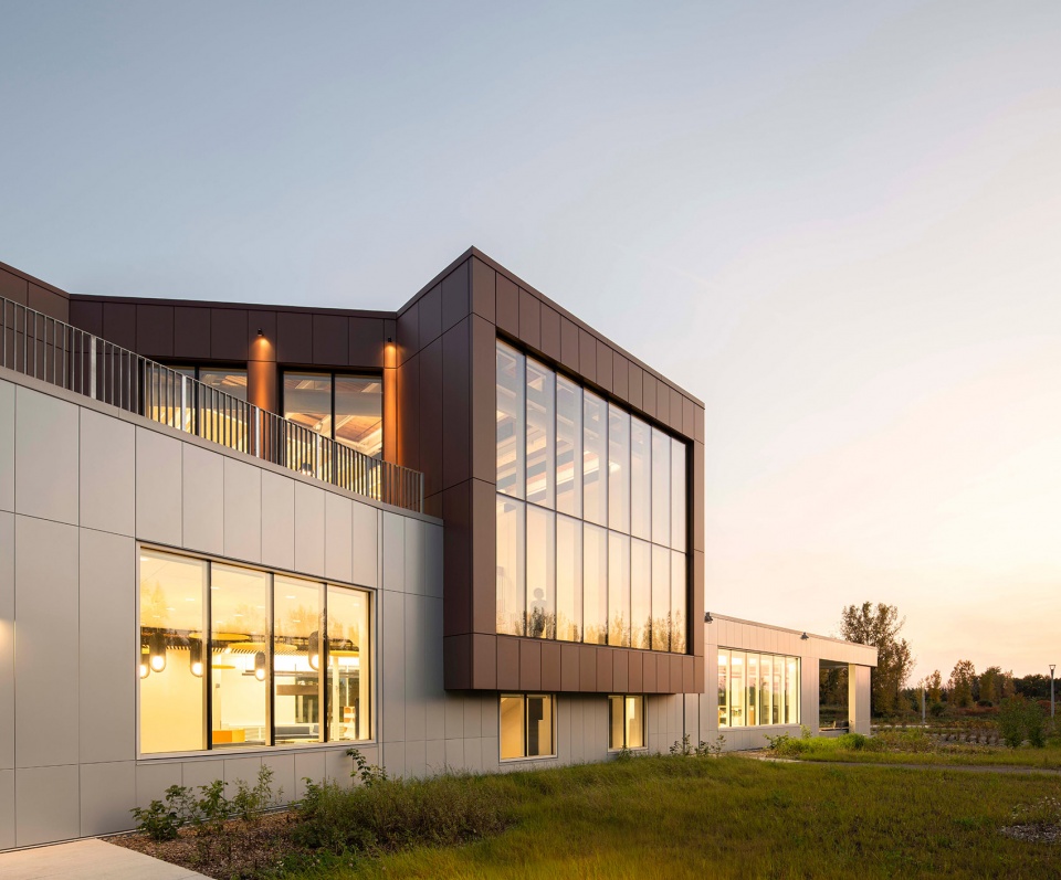 Guided by the sun’s movements, the openings are carefully positioned and punctuated with brise-soleils, ensuring an optimum supply of natural light while limiting overheating in summer. The resulting play of shadows and textures varies with the hours and the seasons, enriching the visual experience of the building. Site integration is at the heart of the architectural approach. With its linear, slightly angular volume, the building stands out as a defining landscape feature, while the earth-toned materials of the second floor ensure a natural harmony with its surroundings. Given that sustainability is a key premise of the project, all design decisions were made to achieve exemplary performance standards, which go well beyond the goal of LEED v4 Gold certification. The integration of passive and active energy strategies into the architecture is a central component of the project’s identity.