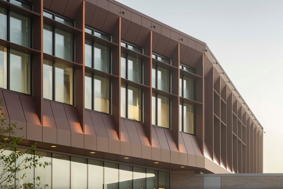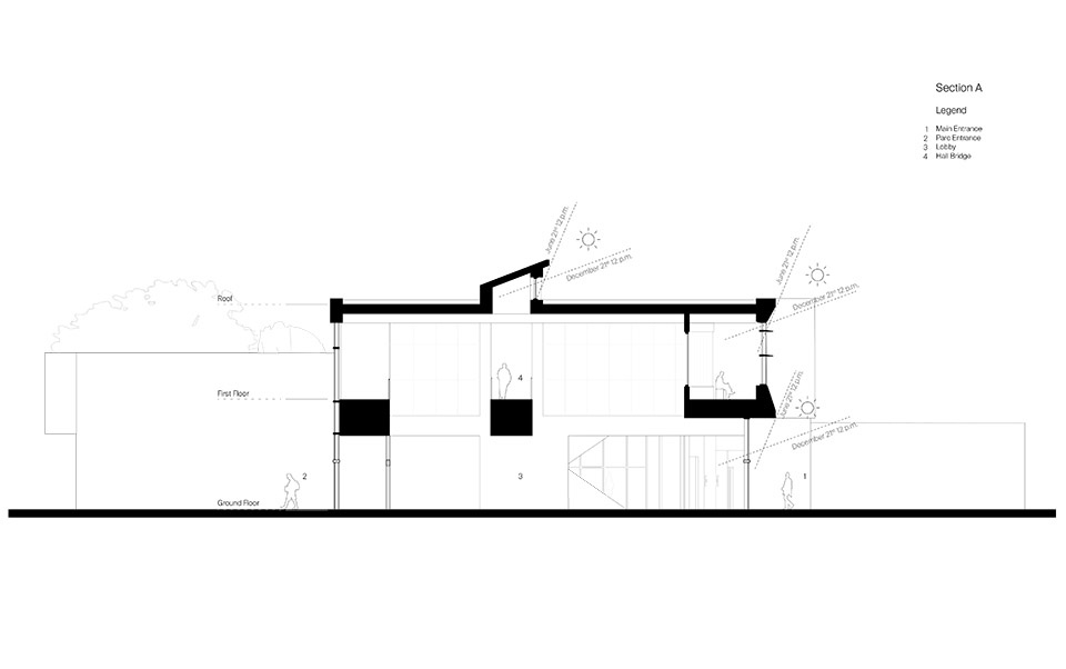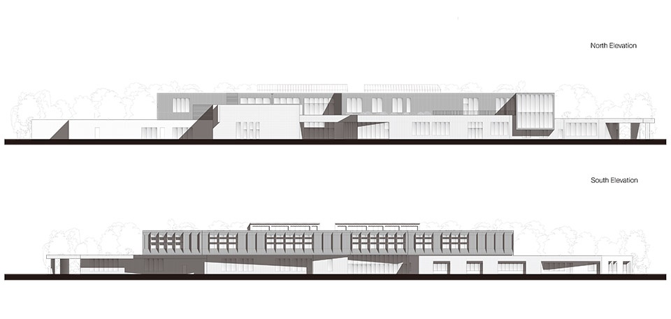 建筑开口的布设遵循太阳轨迹,配合遮阳构件,确保最佳的自然采光同时避免夏季过热。日照带来的光影变化随着时间与季节更迭而呈现丰富层次,为建筑带来动态视觉体验。场地整合是设计核心理念之一。建筑以线性、略带角度的体量,成为场地景观中的显著元素;二层所采用的大地色材质则使其自然地融入周围环境。因项目以可持续发展为首要目标,其所有设计决策均以实现超越LEED v4金级认证的高性能标准为导向。将被动式与主动式能源策略整合入建筑,是该项目核心身份的体现。
