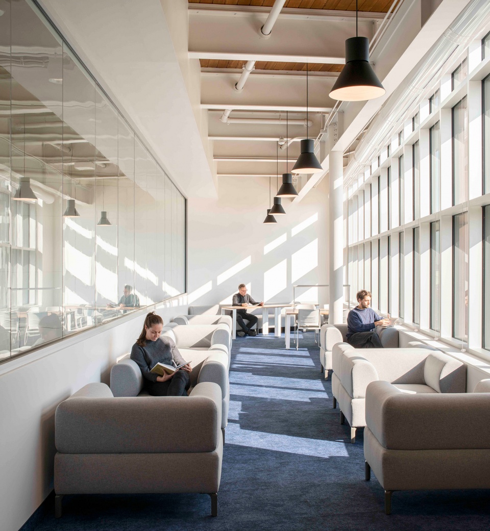 The building’s layout on a vast undeveloped lot made it possible to optimize its alignment along an east-west axis, thereby maximizing its bioclimatic efficiency. In opting for south-facing surfaces, the building’s elongated and angled volume fosters the in take of passive solar energy, while reducing direct thermal gains on the east and west facades. This arrangement improves the project’s thermal comfort and energy performance, while at the same time accentuating its presence as a landmark that can be spotted from avenue Huguette-Gaulin.