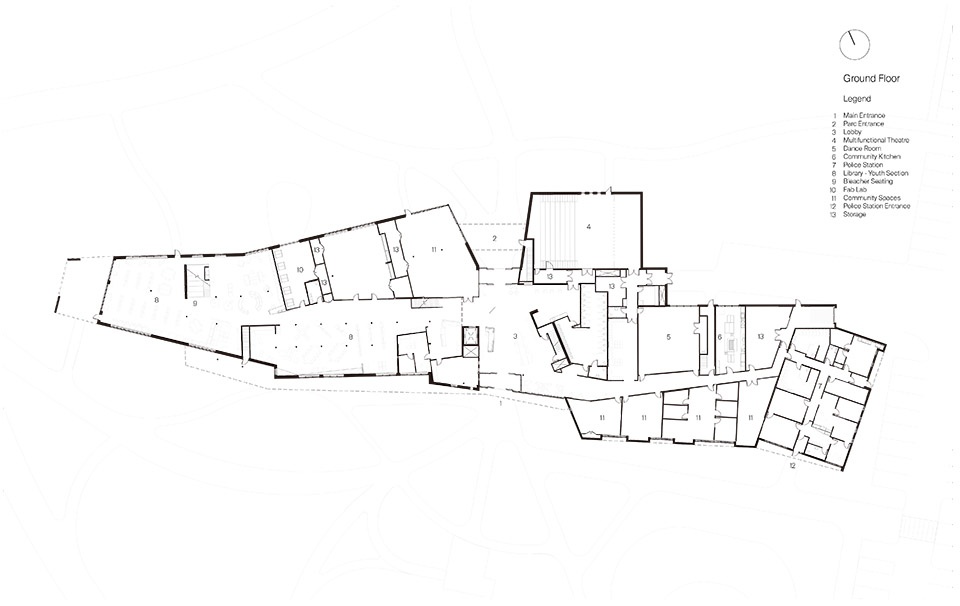 建筑的空间组织围绕中轴线展开:明亮的中央入口大厅是互动与探索的交汇点,连接场地的南北户外空间,形成空间与社交的核心枢纽,便于人们在图书馆、社区空间、剧院与户外区域之间自由流动。该空间布局鼓励探索与直觉式使用,营造顺畅而沉浸的体验。
