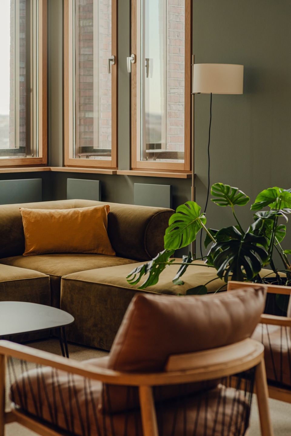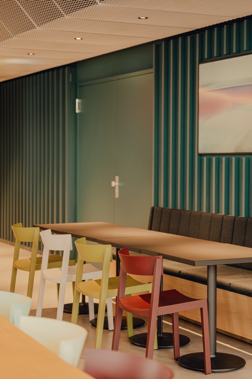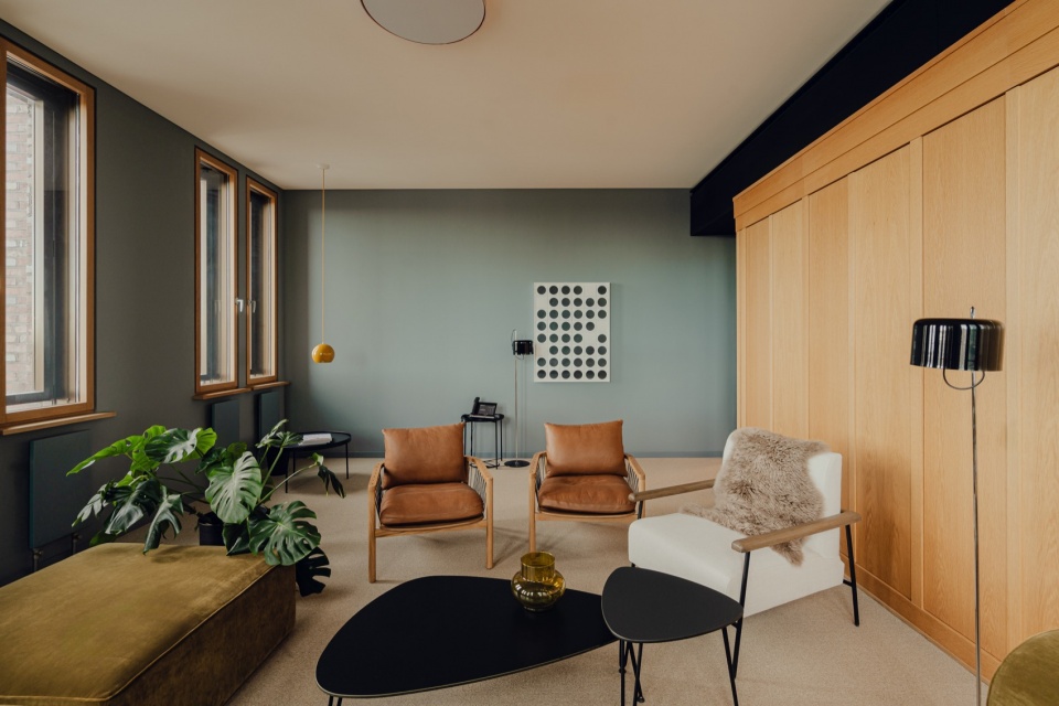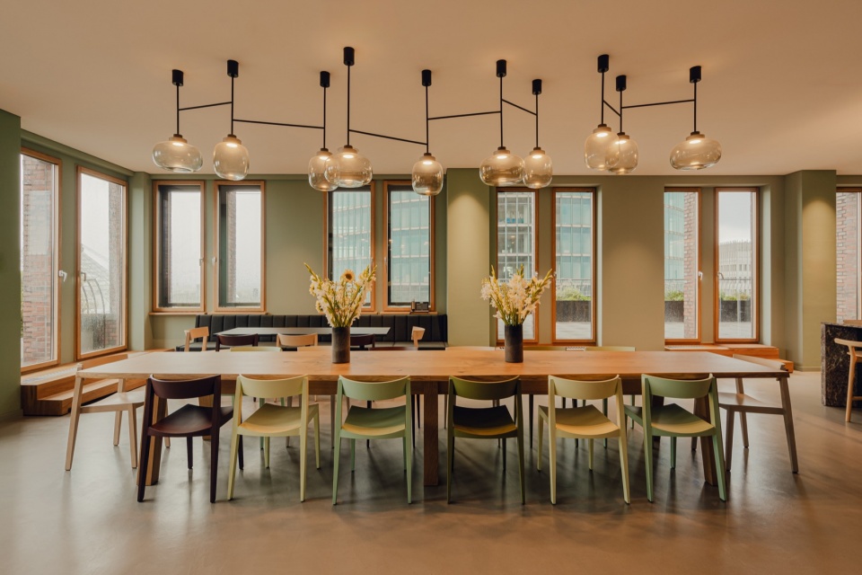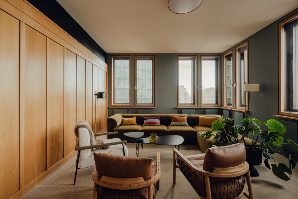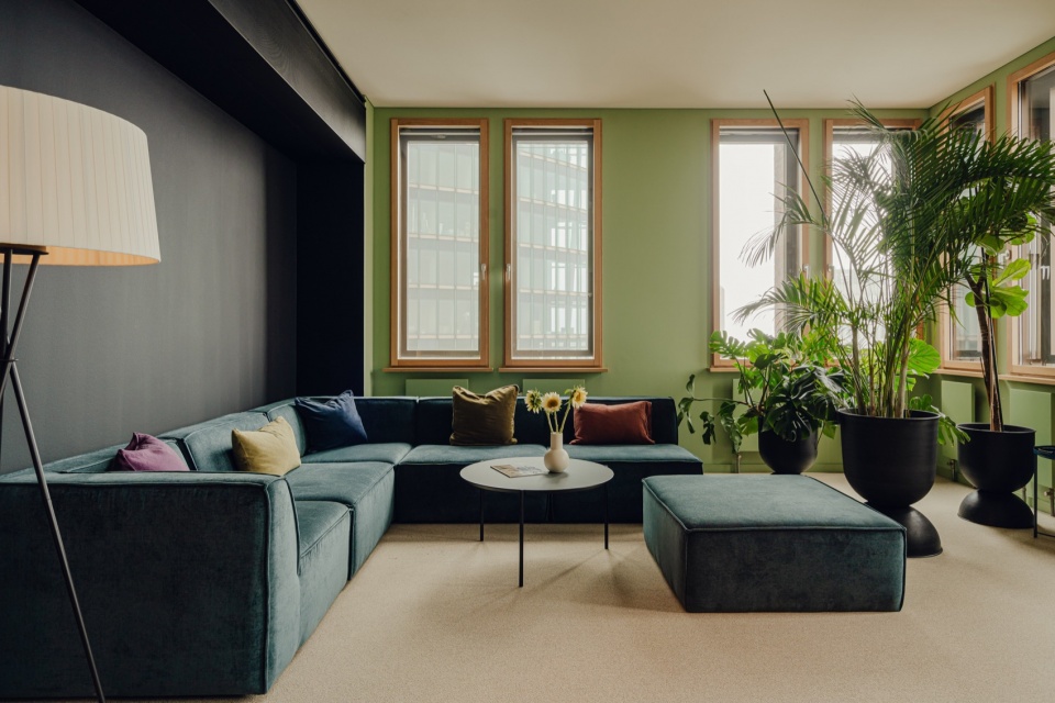 The elaborate interior façade of the high -rise building with its wooden window profiles was retained, however, and Kinzo applied the materials for new fixtures and fittings, including wooden wall paneling and benches or platforms in the offices. The color concept, which Kinzo developed in collaboration with color expert Friederike Tebbe, largely contributes to the homely atmosphere. The petrol -colored cores throughout are complemented by other colors depending on the floor, with warm, muted nuances such as light green, violet, dark blue and terracotta dominating. The fact that the interior design is more reminiscent of a boutique hotel or a chic city apartment in New York is also due to the furnishing of the communal areas: Kinzo curated an eclectic mix of furniture and lighting from mid -century to contemporary, individually selected for each room and complemented with textiles and plants.