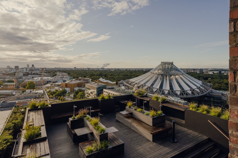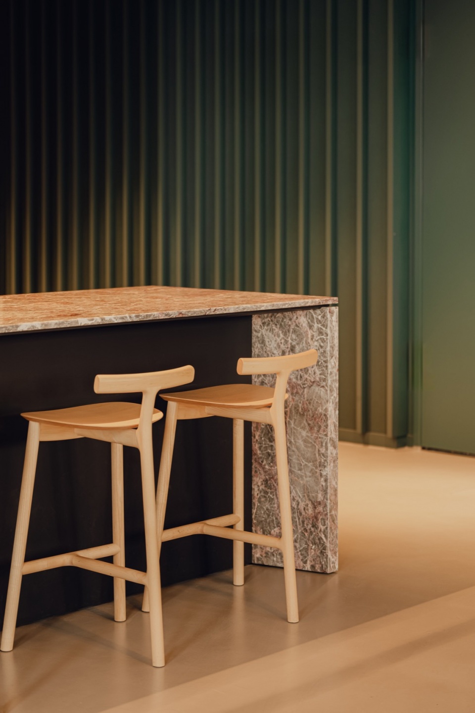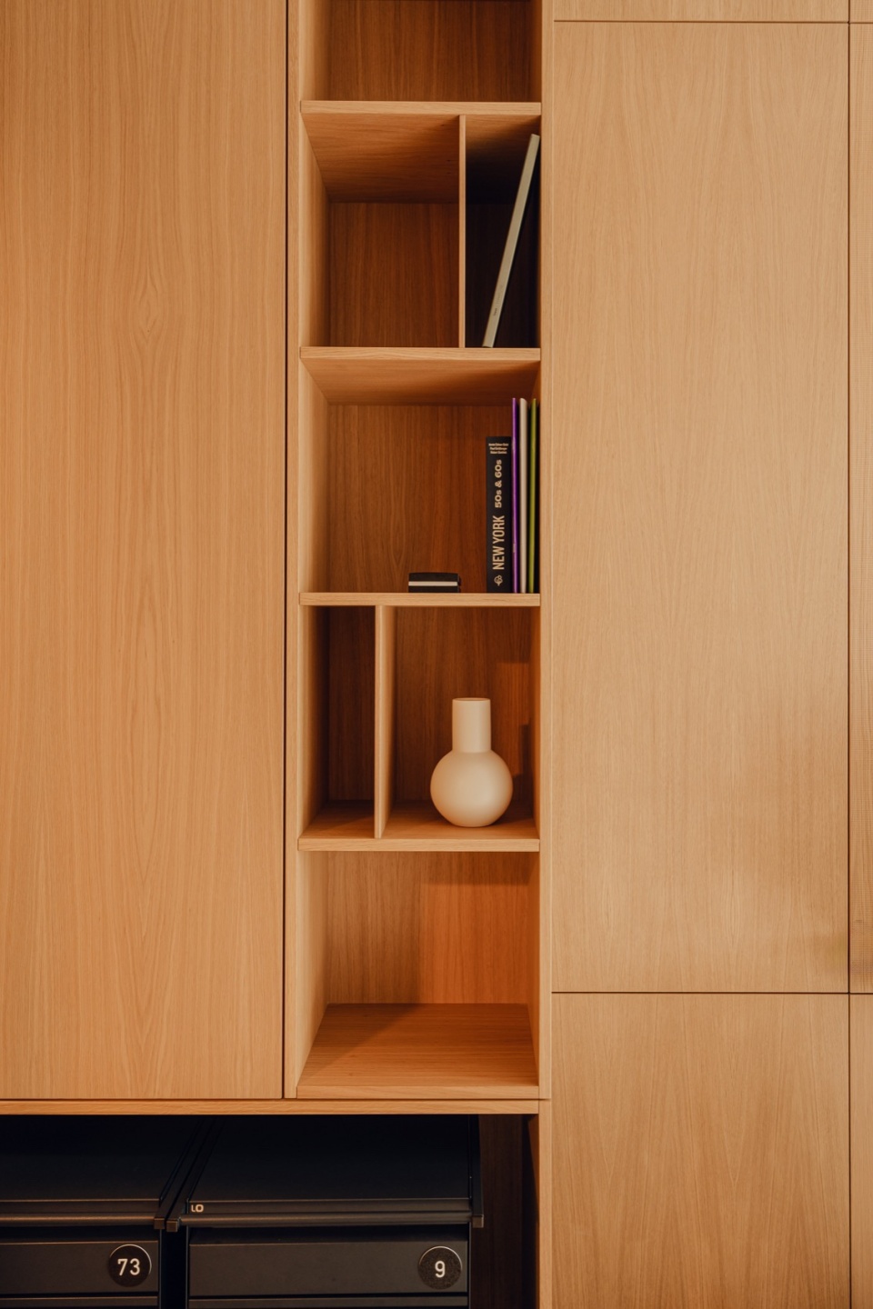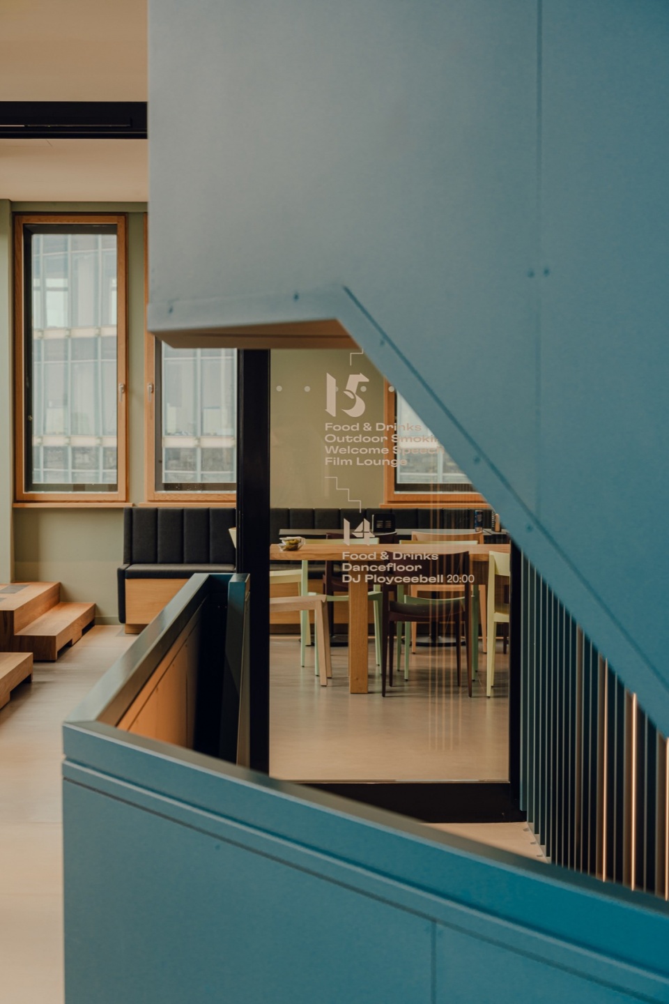 The elaborate interior façade of the high -rise building with its wooden window profiles was retained, however, and Kinzo applied the materials for new fixtures and fittings, including wooden wall paneling and benches or platforms in the offices. The color concept, which Kinzo developed in collaboration with color expert Friederike Tebbe, largely contributes to the homely atmosphere. The petrol -colored cores throughout are complemented by other colors depending on the floor, with warm, muted nuances such as light green, violet, dark blue and terracotta dominating. The fact that the interior design is more reminiscent of a boutique hotel or a chic city apartment in New York is also due to the furnishing of the communal areas: Kinzo curated an eclectic mix of furniture and lighting from mid -century to contemporary, individually selected for each room and complemented with textiles and plants.