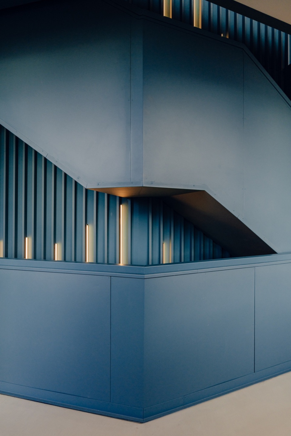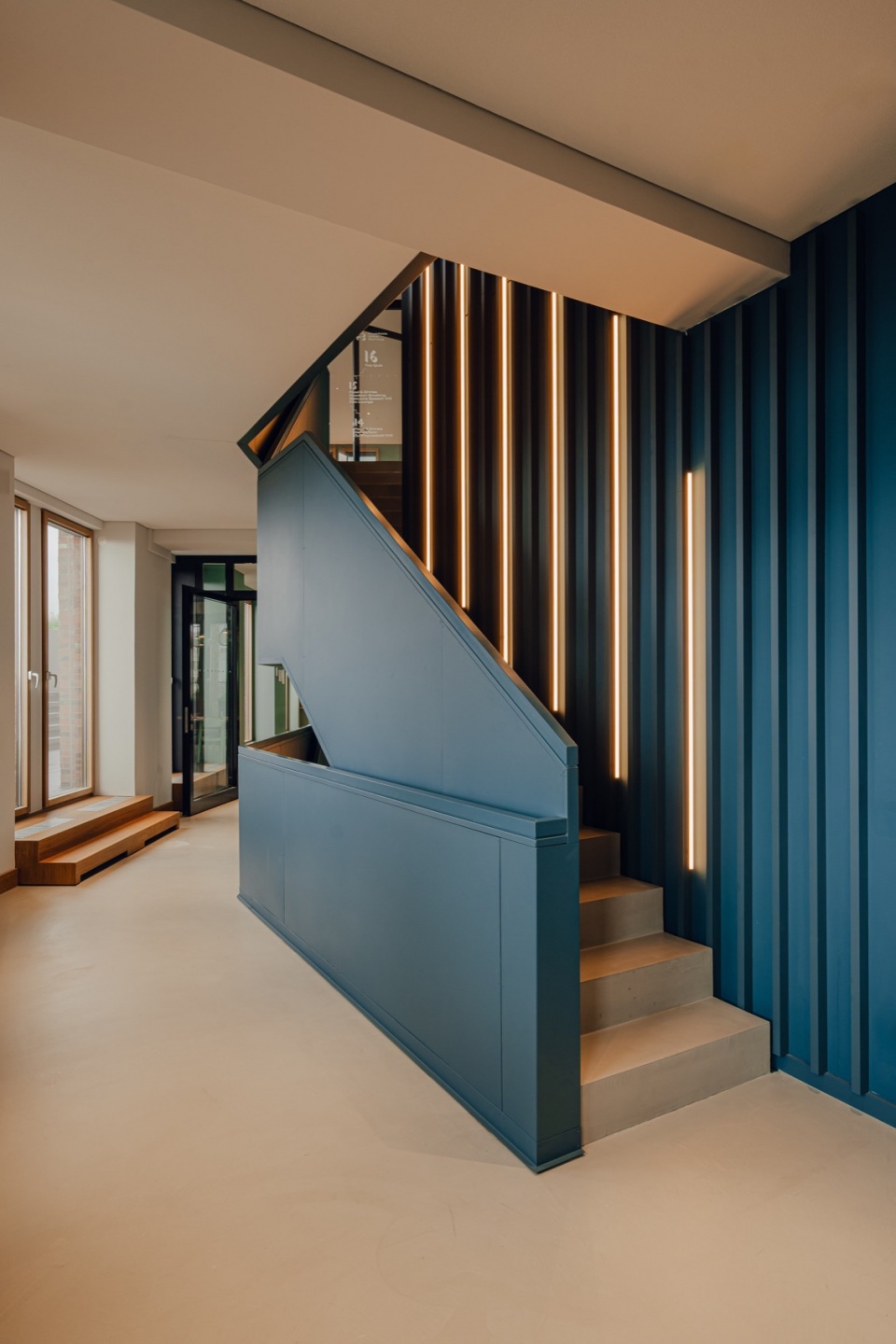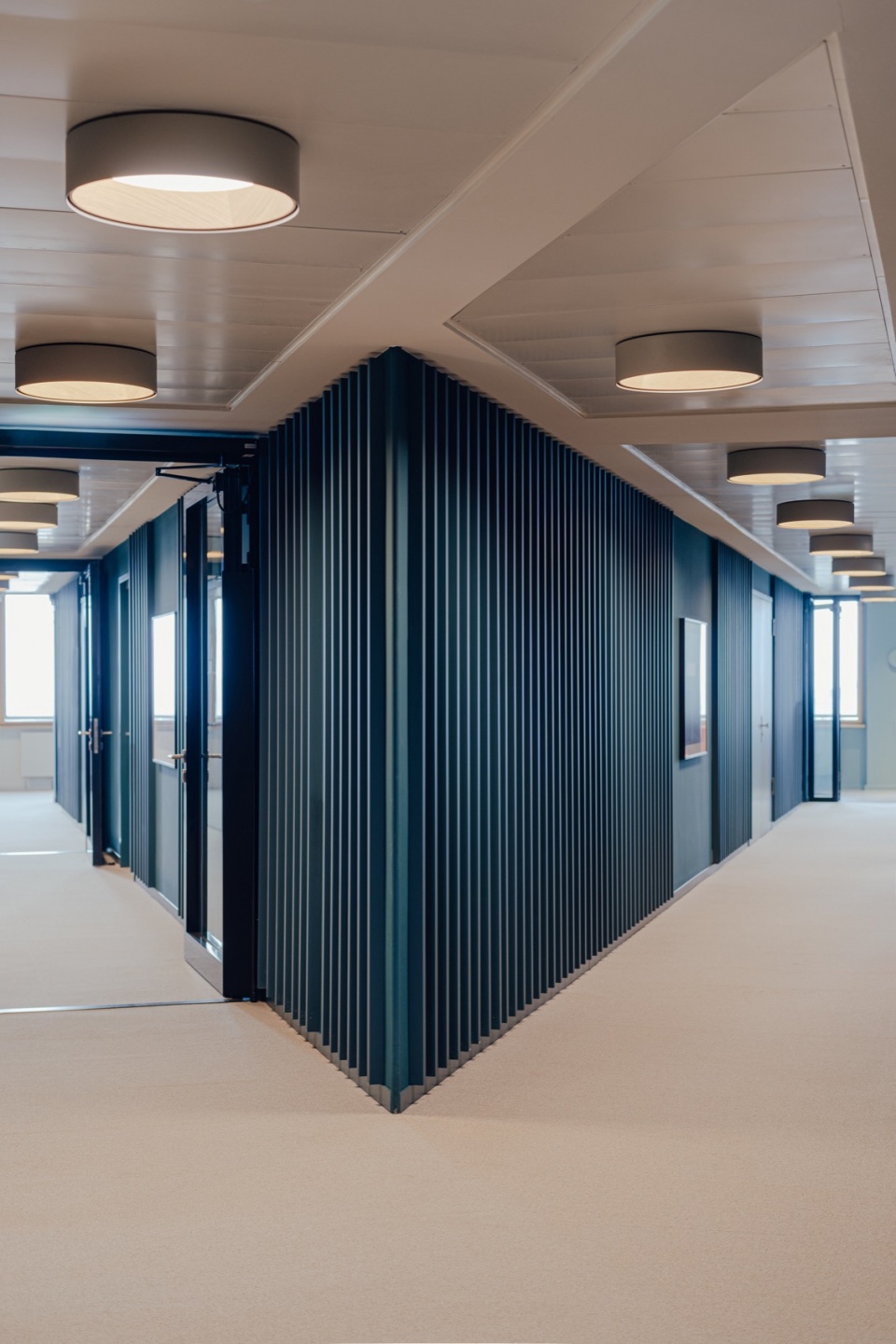 ‘We wanted to preserve the character of the building,’ says Karim El -Ishmawi. ‘We didn’t want to oppose Hans Kollhoff’s design idea of a building in the style of the tower blocks in Manhattan in the 1930s but bring it into the present day.’ Take the massive building cores, for example: ‘The cores are dominant in the architectural structure. So we made a virtue of necessity and gave them a strong aesthetic.’ On all three floors, the building cores are petrol -colored and clad with vertical slats. Doors and other elements are integrated to create a monolithic, compact appearance. This brings strength and calm to the interior. In contrast, Kinzo opted for transparency in the walls between the corridors and offices: instead of the original plasterboard walls, there are now glass partitions that create visual references to the outside. ‘Permeability was important to us. This allows you to experience the building and its location better.’