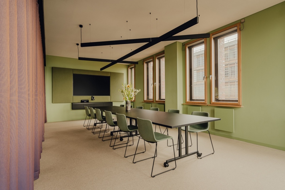 Kinzo还保留了大楼精致的室内木质窗框,并在办公空间中继续运用相似木材打造墙板、坐台与平台。由Kinzo联合色彩专家Friederike Tebbe设计的整体配色方案亦功不可没:三层楼中的墨绿色核心筒搭配淡绿、紫色、深蓝、砖红等温润沉稳的色调,营造出家庭般的氛围。共享区域的家具陈设更令人联想起精品酒店或纽约市中心的雅致公寓——Kinzo为每个空间精心挑选中世纪现代至当代风格的家具与灯具,并辅以织物与绿植,呈现出一套丰富而协调的整体体验。