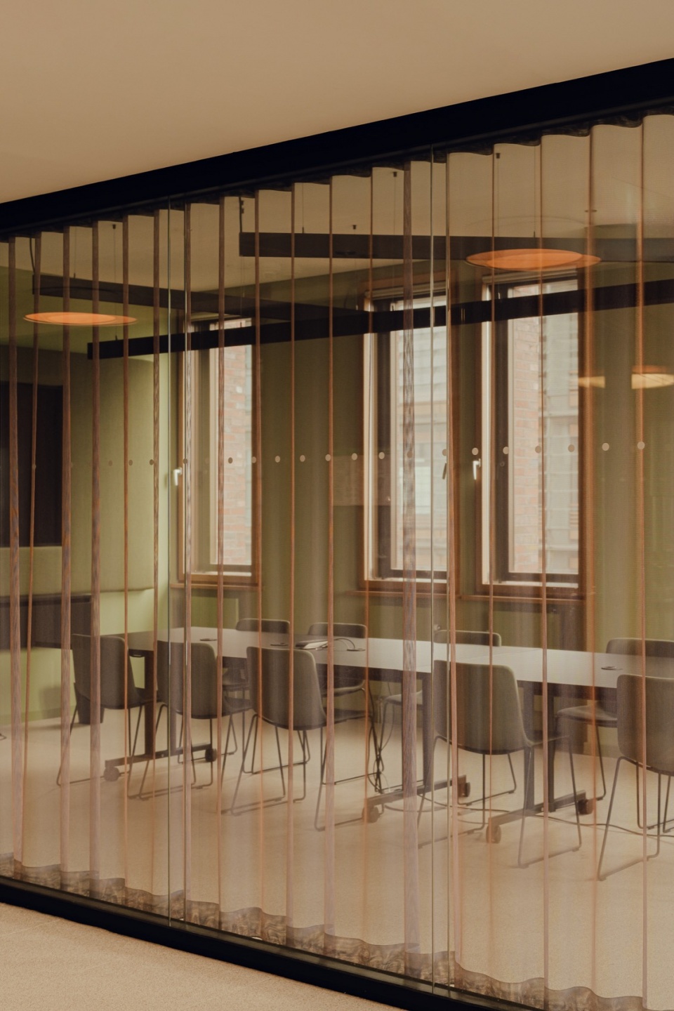 Kinzo在尊重原建筑的基础上进行当代表达:“我们不想违背Hans Kollhoff当年以1930年代曼哈顿塔楼为灵感的设计理念,而是希望将之带入当下。”譬如,原建筑内核心筒体结构十分醒目,因此Kinzo干脆赋予其强烈美学表达:三个楼层的核心筒被统一涂饰为墨绿色,并包覆竖向木饰面板,将门体等元素嵌入其中,呈现出一种整体而有力的沉稳感。相对之下,原本封闭的办公间隔墙则被改为玻璃隔断,加强视野通透,让使用者能更好感知建筑与其所在城市之间的关系。