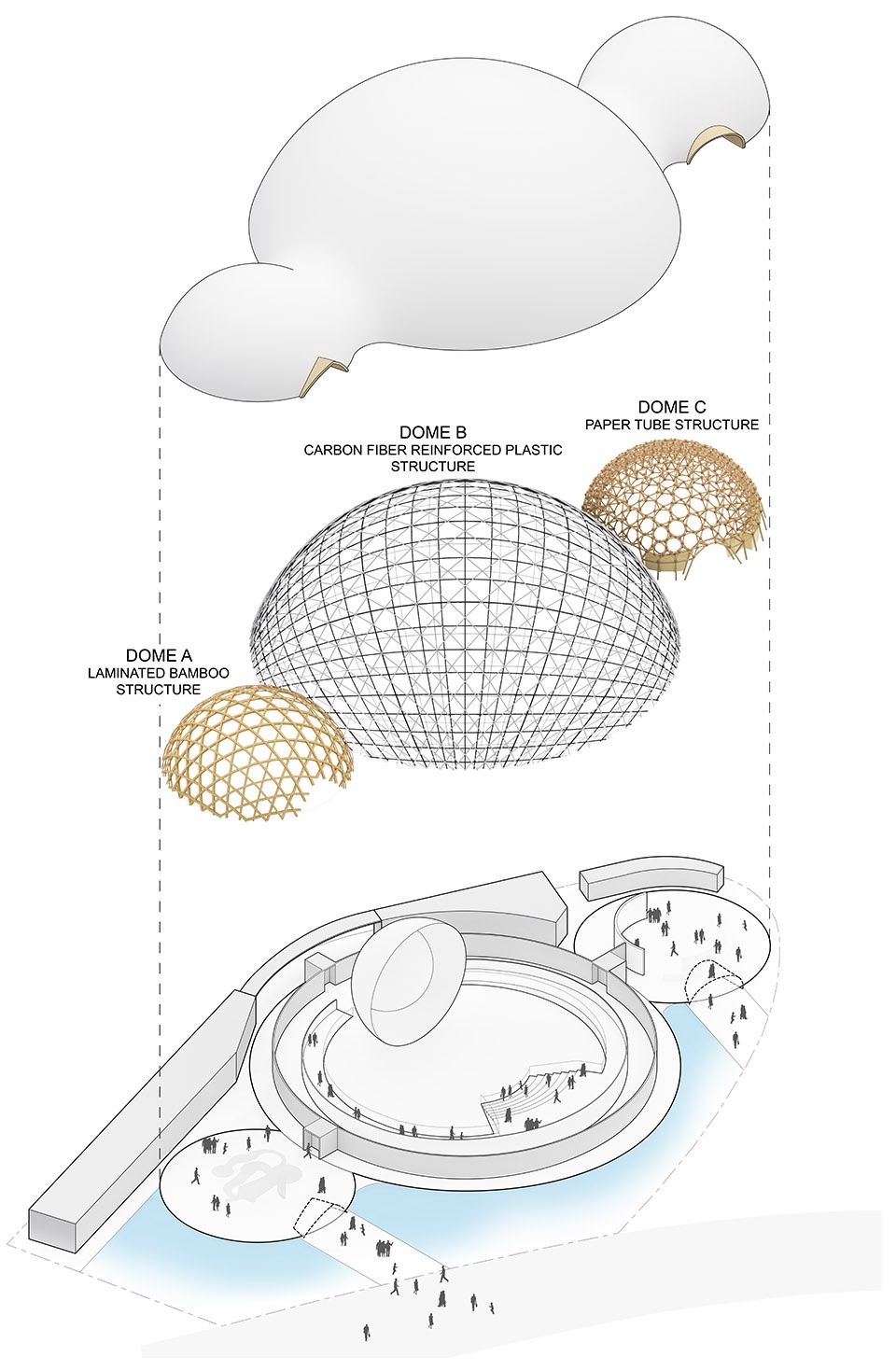 The pavilion is composed of three domes. Dome A, serving as the entrance, is built from laminated bamboo. This approach addresses the growing problem of abandoned bamboo groves in Japan, which can destabilize land due to their shallow roots. Raw bamboo is difficult to use structurally, so it was processed into thin, laminated boards that are even stronger than wood. These were shaped into a 19-meter dome inspired by traditional Japanese bamboo hats, transforming an environmental concern into a building solution.