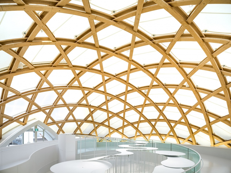 展馆由三个穹顶构成:穹顶A作为入口空间,由层压竹材建成。这一设计回应了日本日益严重的废弃竹林问题,竹子根系浅,不加管理会导致土地不稳定。由于原始竹材不适合直接用于结构用途,设计团队将其加工为薄片状的层压板材,其强度甚至超过木材。这些板材被构造成一个直径19米的穹顶,灵感来自日本传统的竹编斗笠,巧妙地将生态问题转化为建筑解决方案。