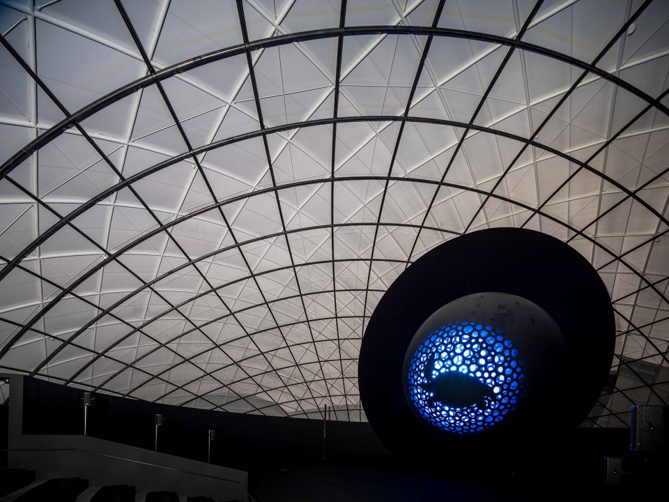 穹顶C同样为19米直径,由100%可回收的纸管构成。纸管以木质球体为节点,组装为三维桁架结构,整体形式令人联想到分子结构,既轻盈又富有表现力。