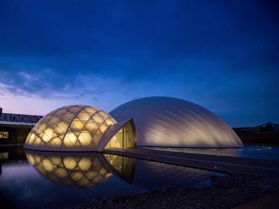 Dome B, the central and largest structure with a diameter of 42 meters, uses CFRP as its primary material. Known for its strength and lightweight properties—four times stronger than steel but only one-fifth the weight—CFRP is usually reserved for industries like aerospace and automotive. Its use in architecture is rare due to its high cost, but it was ideal for this project, in order to minimize foundation weight on the reclaimed land of the Expo site. To avoid the environmental impact of deep foundation piles, the structure needed to weigh less than the soil removed for its foundation. CFRP allowed the dome to meet this requirement while maintaining structural integrity.