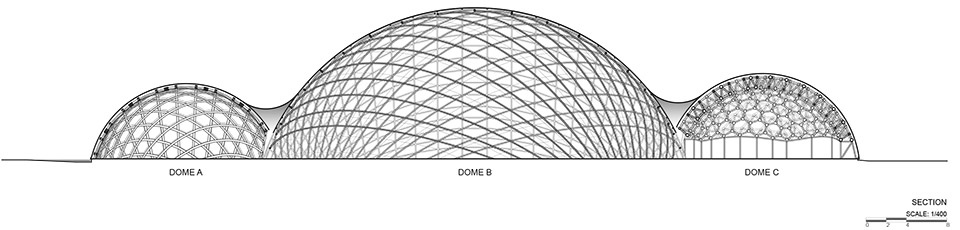 穹顶B是中心主结构,直径达42米,主要采用CFRP材料建造。CFRP因其高强度与轻量特性广泛应用于航空航天与汽车工业,其强度为钢的四倍,但重量仅为其五分之一。由于成本高昂,在建筑领域使用较少。然而,该项目位于填海地,为了避免使用对环境影响较大的深基础桩,结构重量必须低于为基础开挖所移除的土壤重量,CFRP因此成为理想材料,既满足重量要求,又保证结构稳定性。